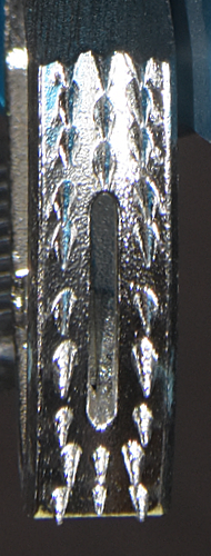 The cam is a stainless steel casting with an open web. The cam radius increases from 38 to 57 mm. over an angle of 44°, giving a 28° cam angle. The cam has number of small conical teeth, all of which have their axes approximately aligned with the cam axle. The tooth pattern is (3)^3(1S1)^5(3)^2.