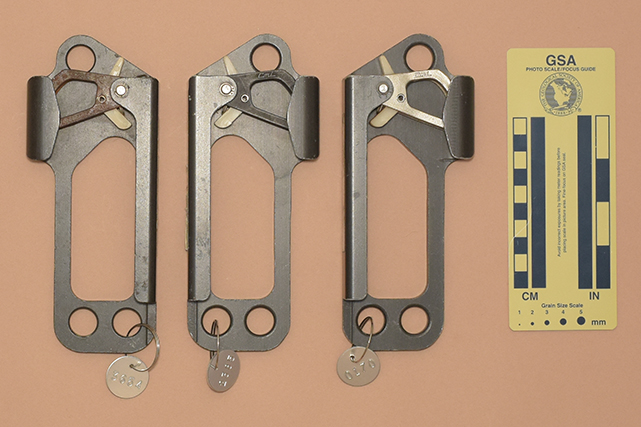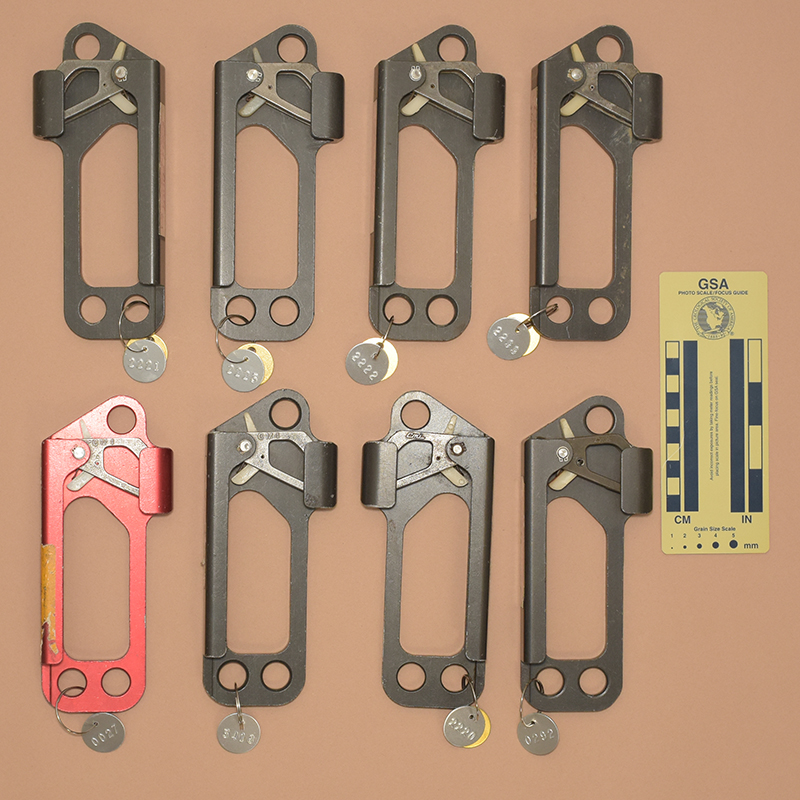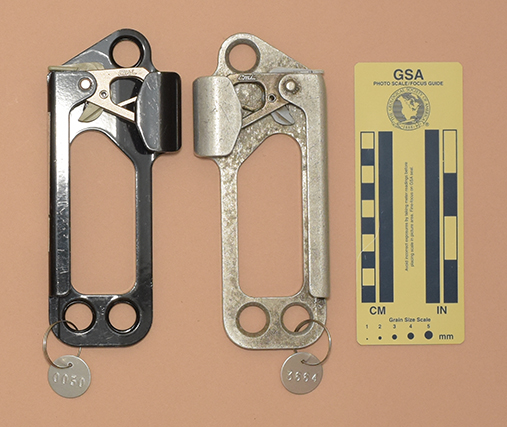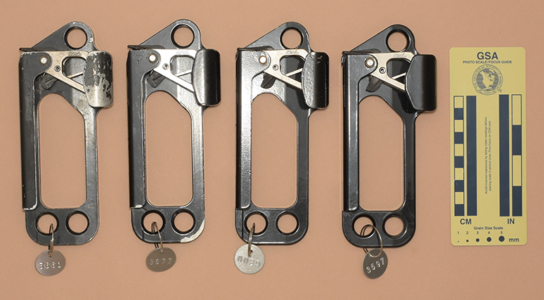This pair has prototype frames. According to Bob’s notes, he acquired these from the collection of Ray Seutur of the Cleveland Grotto. They were sold as a pair. Stickers on the ascenders and Bob’s notes state that these were not heat treated and should not be used.
