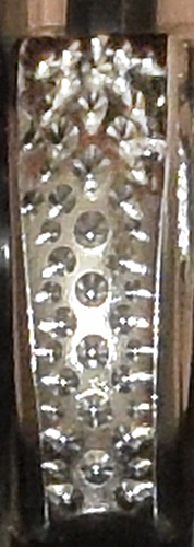 The cam has been modified in several ways and matches the Shorti IV cam. A reinforcing bar now extends from the back of the cam face arc to the mid-bottom of the cam, providing better cam face support under load. The cam radius increases from 32 to 51 mm. over an angle of 48°, giving a 29° cam angle. The conical teeth are larger, sharper, and better made, and the tooth count has been changed to (5.4)^2(3.4)^3(3.2). The teeth are now oriented parallel to the top of the cam. The cam finish appears to be plated, but this may be just a change in alloy or heat treating. "Cmi" is cast on the side of the cam.