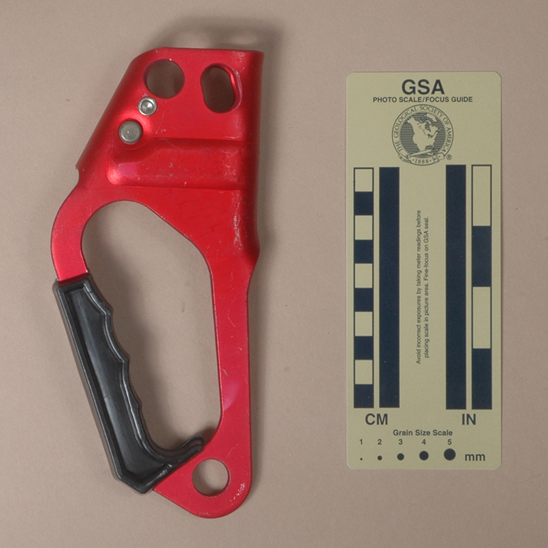 The handle below the cam has a soft black plastic hand grip molded into place. The hand grip has four finger grooves. A 15 mm. sling attachment hole is punched below the handle opening. This hole is slightly beveled. A 19.2 by 13.3 mm. hole through both sides of the rope channel provides an attachment point just above the cam. A second 17.7 mm. hole above the cam provides a second top attachment point.