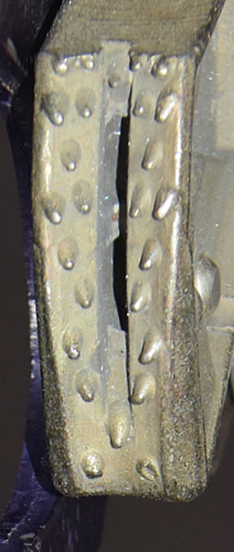 The cam is a plated skeletonized steel casting. The cam radius increases from 39 to 51 mm. over an angle of 36°, giving a 22° cam angle. The cam has number of small blunt conical teeth. The tooth pattern is (3.2)(1S1)^1(2.1.2). Like most eccentric cam ascenders, the inner cam face radius reduces from top to bottom to accommodate various sized ropes.