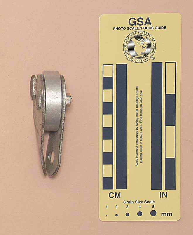 The Pishchepromavtomatika Drop consists of a pivoting lever and an anvil mounted between two side plates. One side plate is stationary, while the other pivots on the lever axle so that it may be opened to admit the rope. A notch on the lower left side of the swinging plate slides under the head of a shoulder nut on one of the anvil screws when the ascender is closed. The right side has 12 mm. holes passing through both plates, forming an attachment eye. A second 12 mm. hole in the rear plate does not have an obvious function.