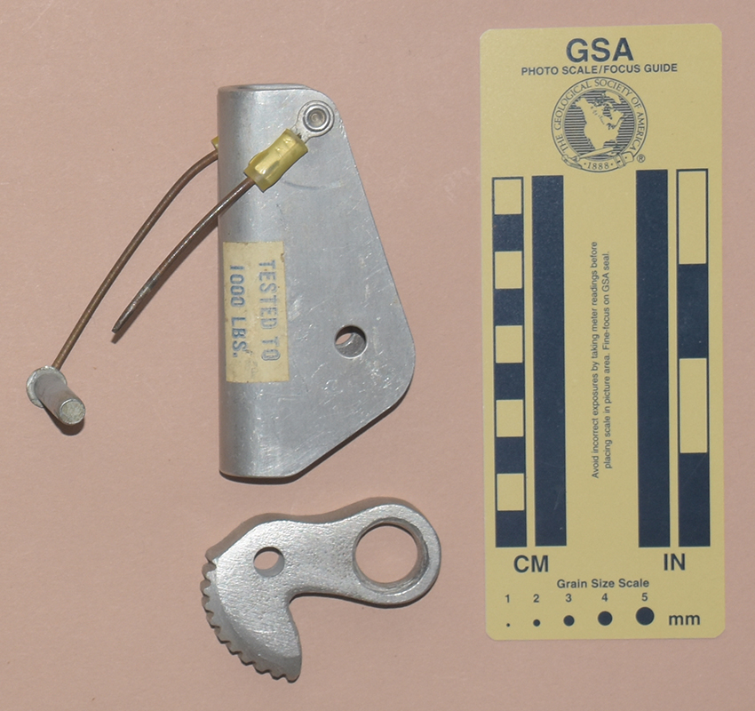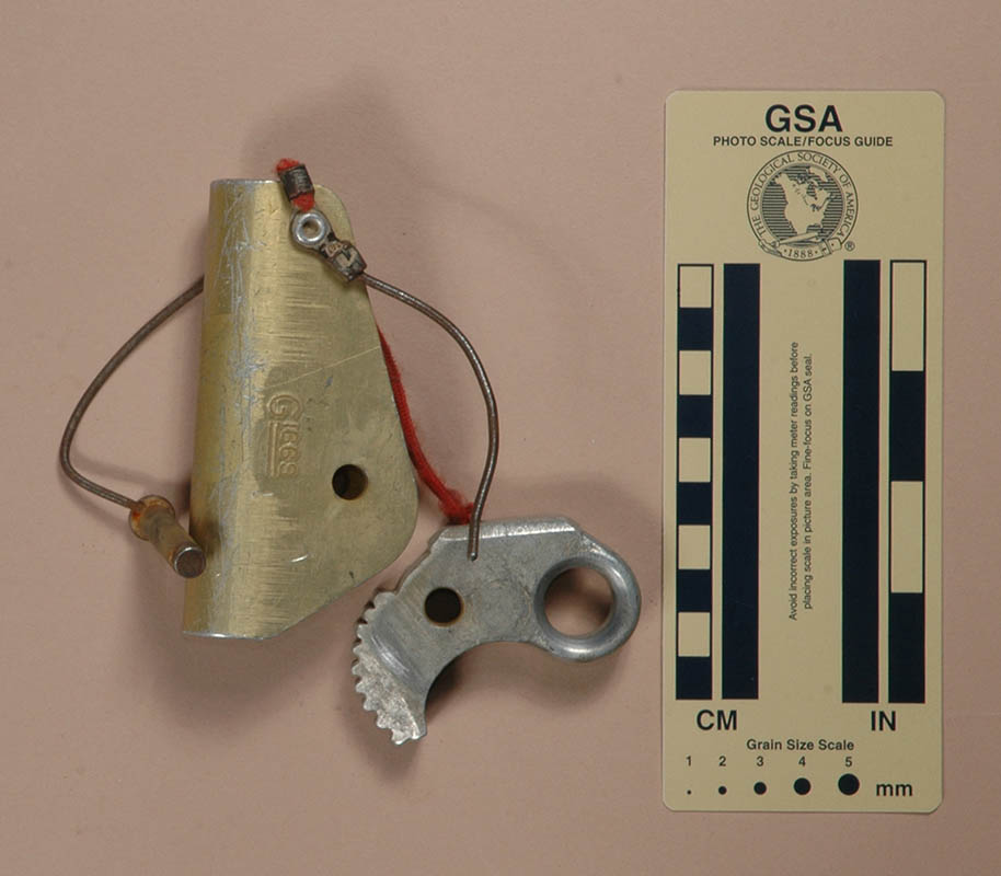 Version A is 103 mm. tall, 64 mm. wide, 36 mm. thick, and weighs 148 g. The shell is bent from 1/8 in aluminum to form a U-shaped groove. The cam is cast aluminum. It has 11 teeth, and is tapered near the tip, something some copies have failed to do. The cam rides on a steel pin axle that is drilled at the end to accept a retainer. The retainers on this Gibbs are 0.1 inch nylon line. The same material is used as a pin keeper.
