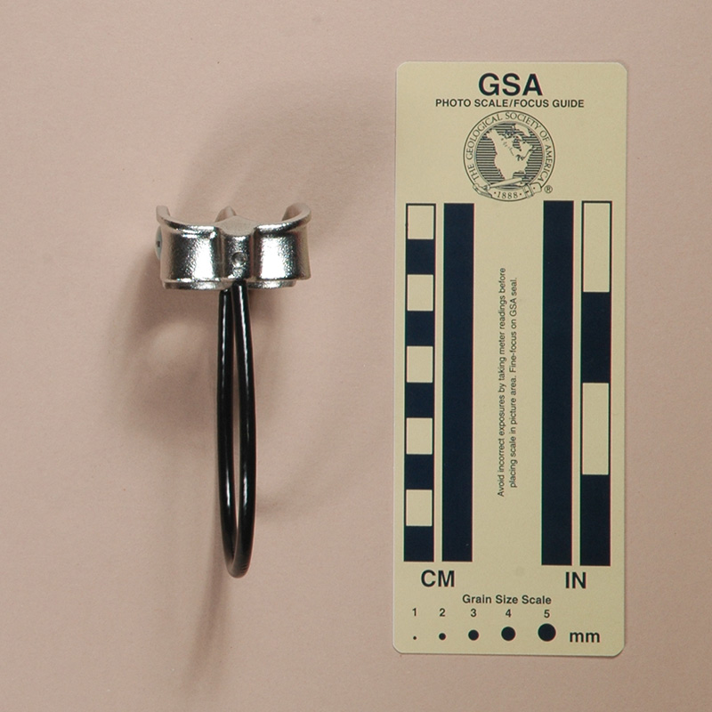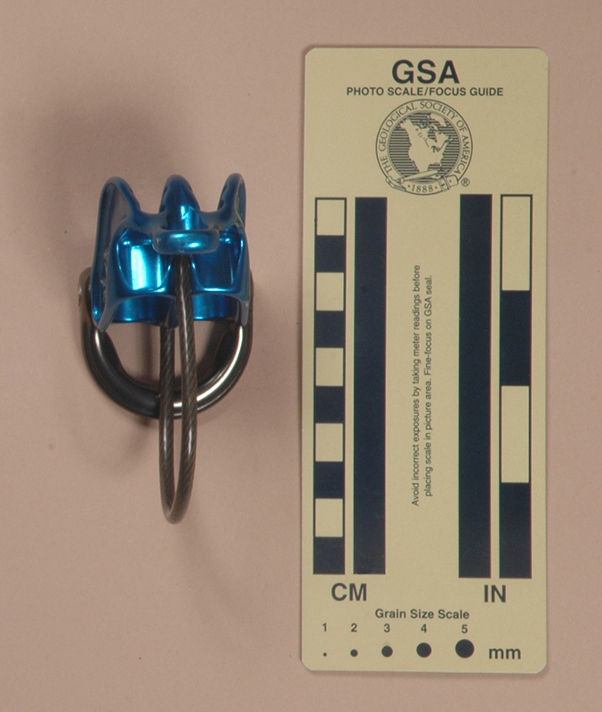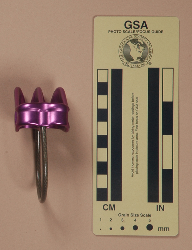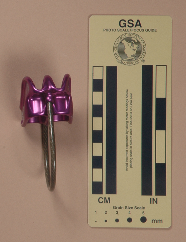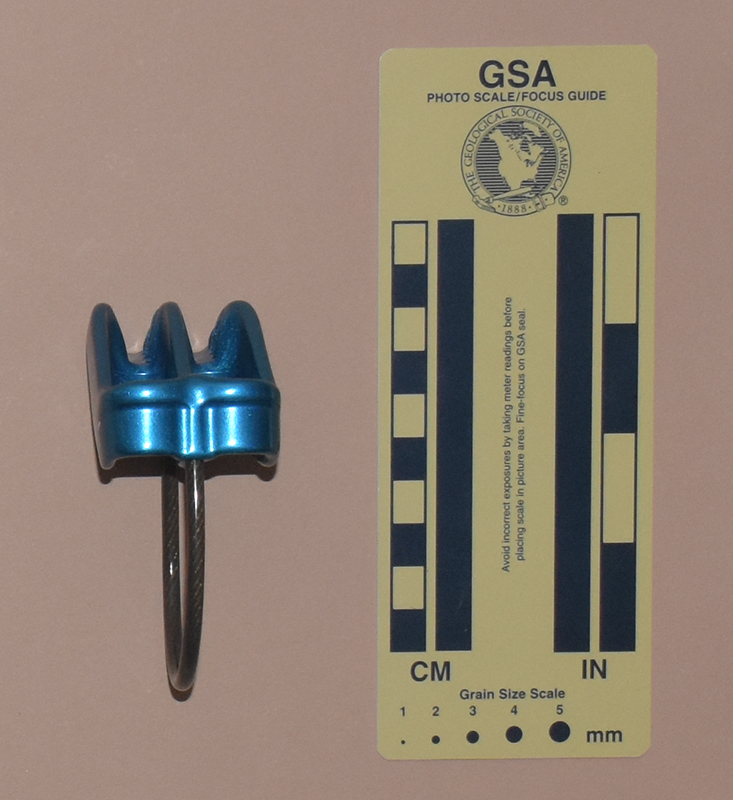 Version B is forged from aluminum alloy. Mine is 41 mm. long, 42 mm. wide, 76 mm. high, and weighs 27 g. The slots are 28 mm. long and 12 mm. wide. The top of the Omega oval carabiner that I use for comparing belay tubes sits 9 mm. below the ends of the slots. The Bugette has a distinct wedge shape. The slots are D-shaped rather than oval. The keeper is a moderately stiff plastic-covered wire.