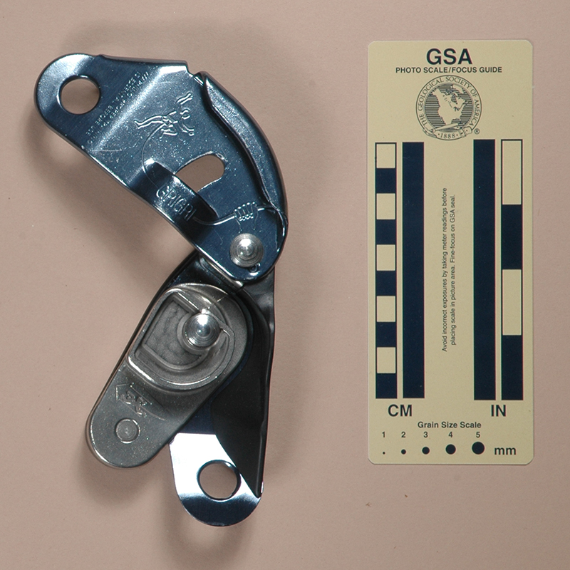 The Grigri + consists of a spring-loaded cam assembly mounted between a back plate and a swinging front plate. The rear plate is stamped from 2.4 mm. aluminum alloy and then anodized. The front plate is forger and/or milled from aluminum alloy and also anodized. The plates are shaped roughly like a avocado. The two plates are loosely riveted together near the top, with a 15.5 mm. stamped stainless steel anvil that serves as spacer between the two. The front plate can rotate about 135° clockwise with respect to the rear plate and spacer, allowing one to open the Grigri for rigging. The two plates have inward bends near the bottom, where 17.8 × 15.8 subtriangular attachment holes pass through the sloping portion of the plates. The inside of the front plate has a milled channel to pass the head of the cam axle. A 1 mm. stamped stainless steel piece riveted to the front plate provides a lip to engage a notch in the cam axle when the front plate is closed. This stainless steel piece extends around to the front of the front plate, providing a 7.2 mm. diameter curved surface for the rope to run over. A plastic spine fills the right side of the device between the plates. A plastic cover attached behind the rear plate covers the cam spring mechanism. This cover can be rotated and latched into one of two positions.