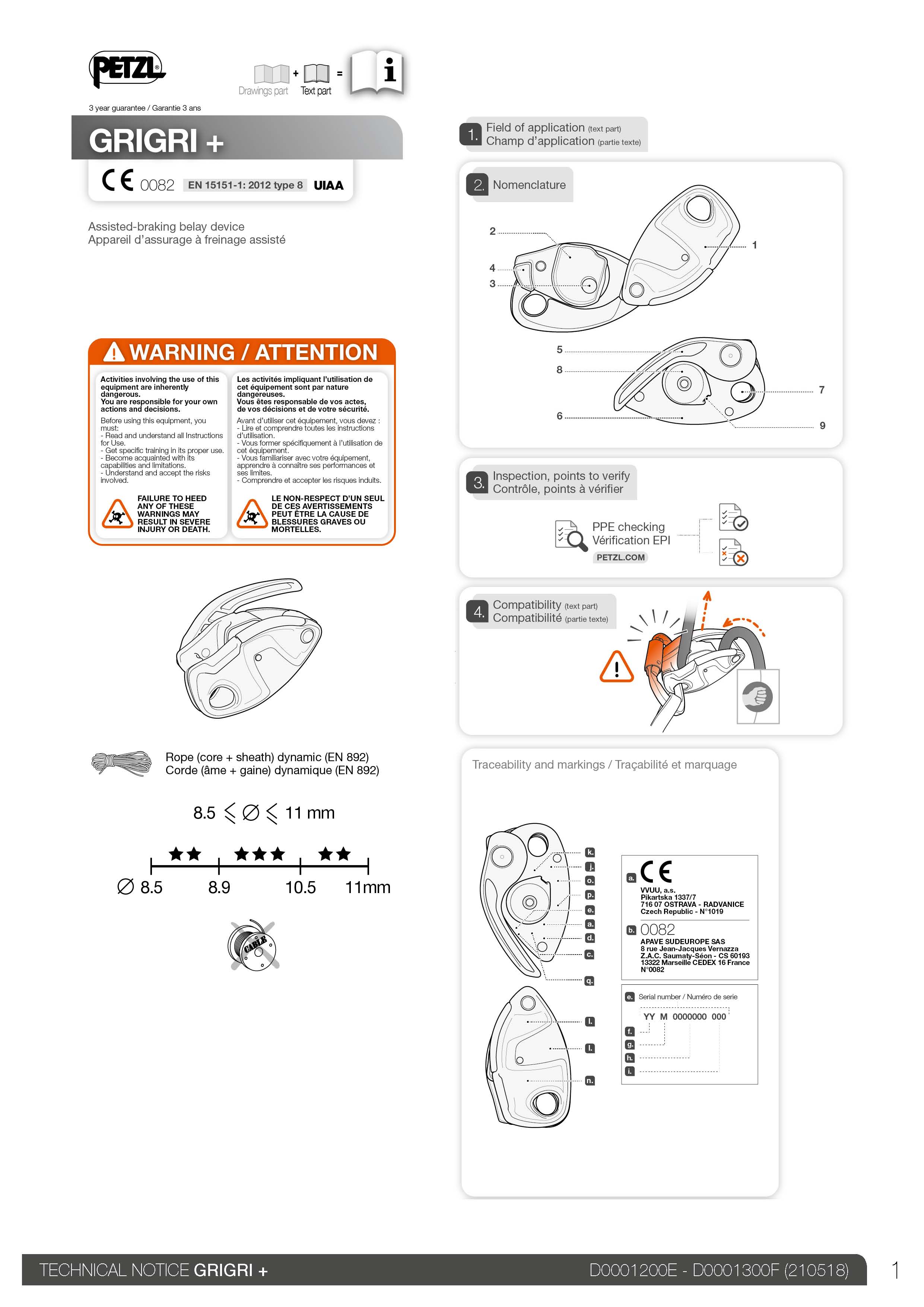 The front plate is stamped with "GRIGRI" and rigging illustrations. The spine is printed with the Petzl logo. The cam assembly has the Petzl logo and a rigging illustration consisting of a roped climber inside an arrow cast into it. The handle has "made in France" molded into the rear side. The rear plate is printed with "Petzl," "F-38920," and "Crolles Cidex 105A;" "19C0183113482;" a scanner code; a divided line segment with the division marks labeled below with "Ø10," "8.9," "9.4, "10.5, and 11mm" and the three segments labeled above with "**," "***," and "**," respectively; "CE" and "0082;," a book-with-an-"i" icon; "FOR ROPE1UIAA;" and "EN15151-1 UIAA." The fairing has the Petzl logo and "Patented" molded into it.