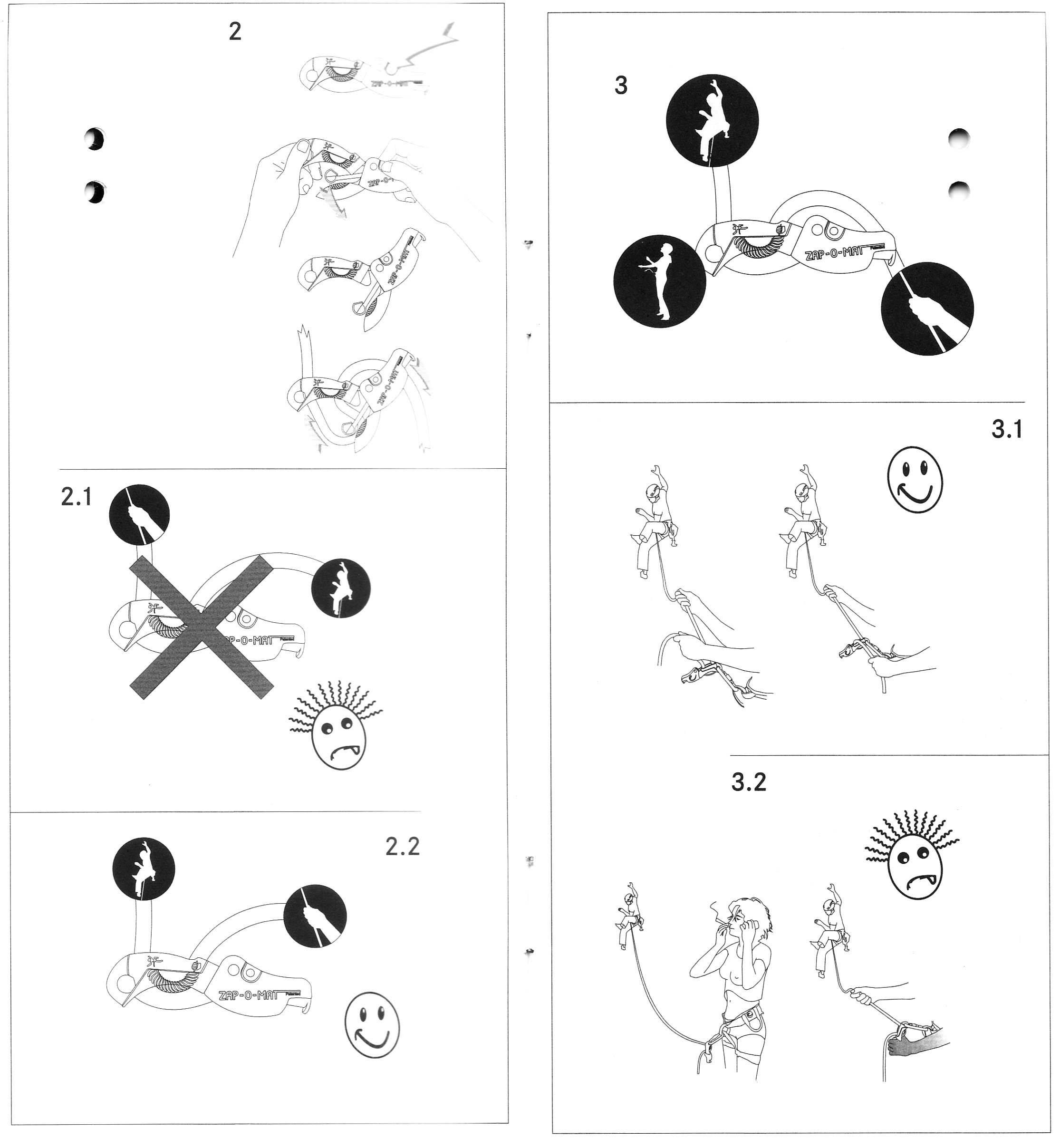 Each side of the body has a climber icon near the distal end of the rope channel and a hand-holding-a-rope icon near the handle. The rear side also has a book-with-an-"i" icon, "10P**" (*=illegible, perhaps "eS"), "8.9<•<10.5 mm," "EN***" (*=illegible, probably "892"), and an icon consisting of two concentric circles with "08" in the center, 12 radial lines between the two circles, and dots in the sectors from 1:00 to 4:00 (most likely indicating manufacturer in April 2008). The front of the handle has "ZAP-O-MAT" and "Patented" molded into it, and the rear has a large "e." "MADE IN GERMANY," CE 0123," and "EN 15151."