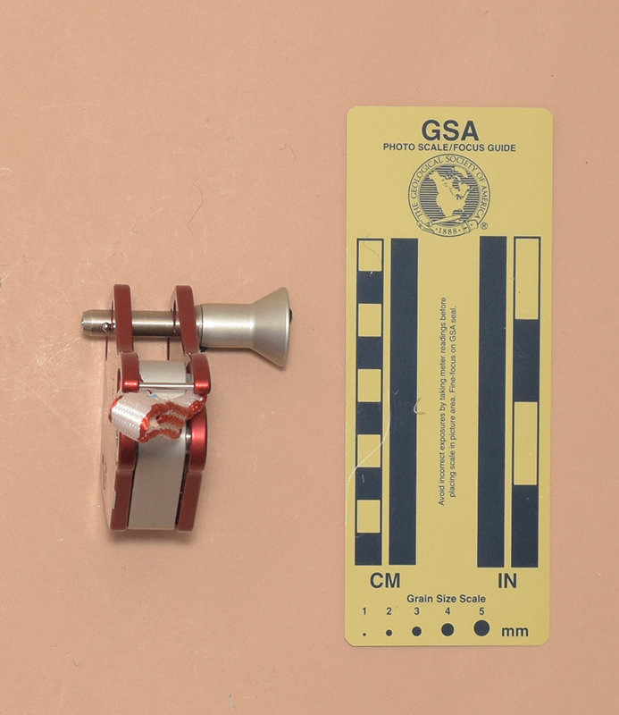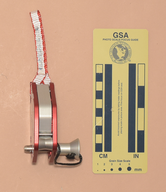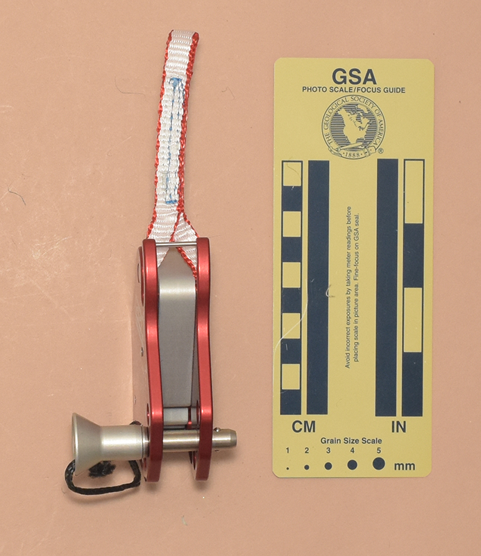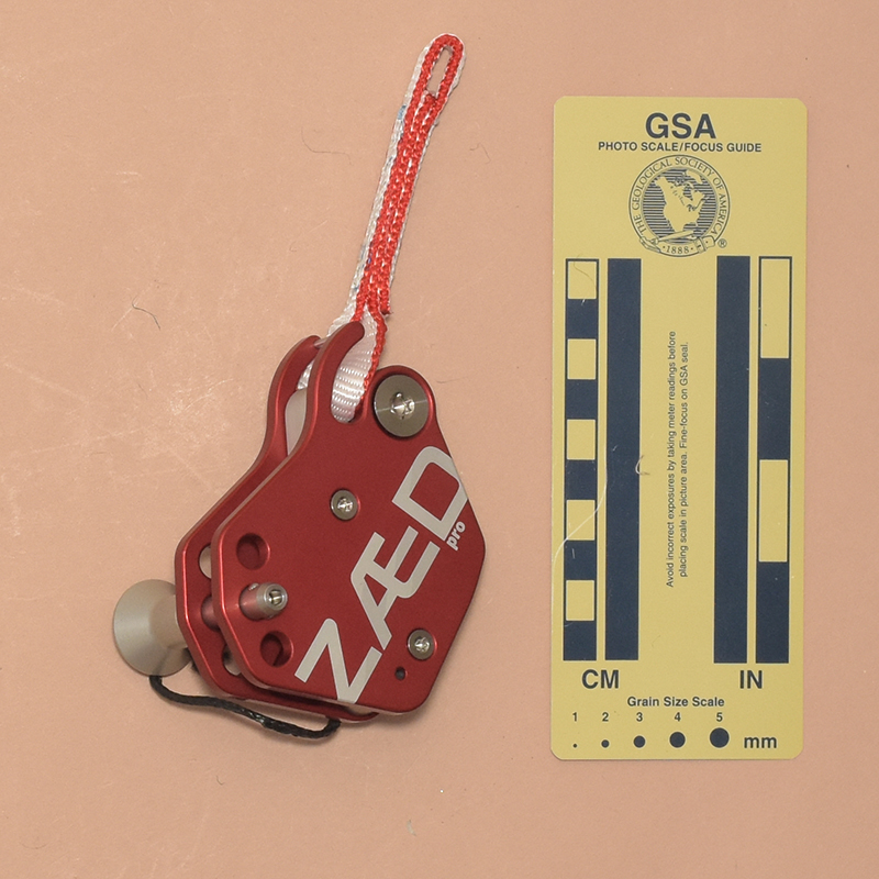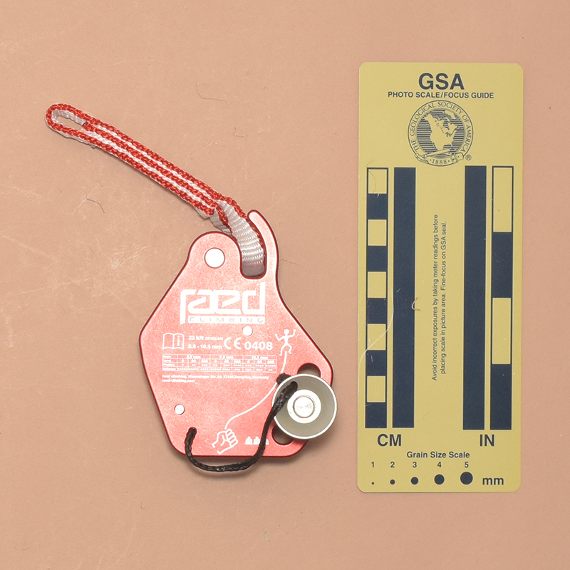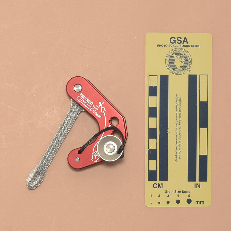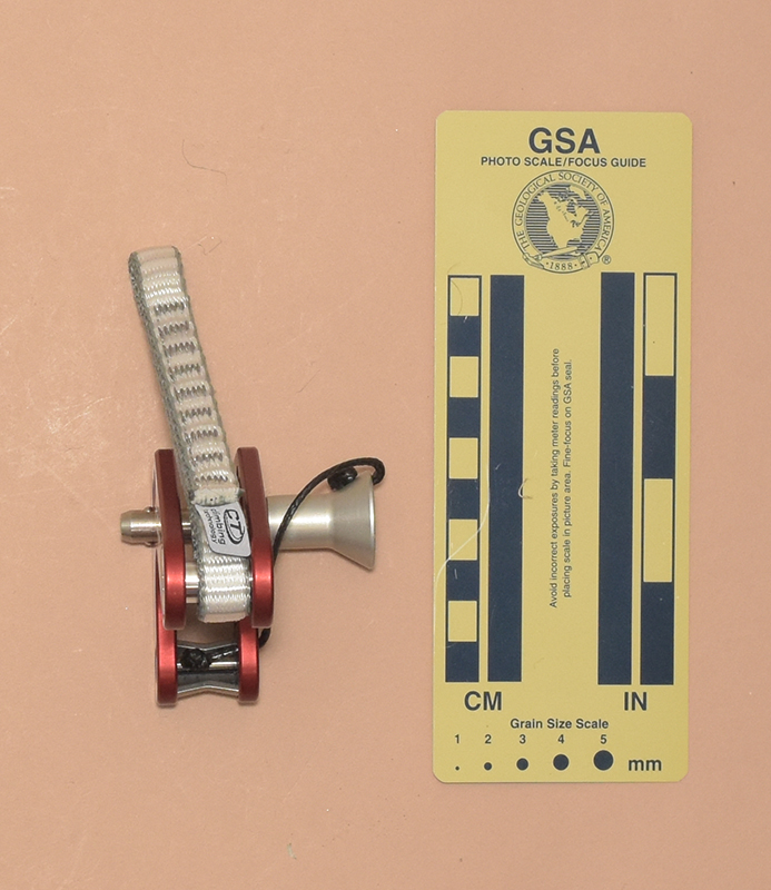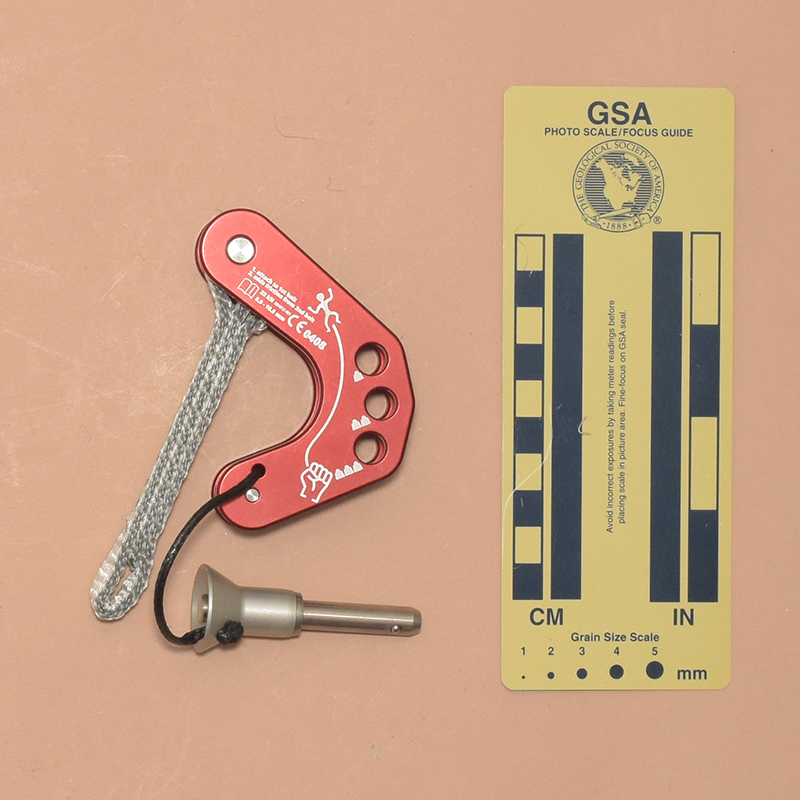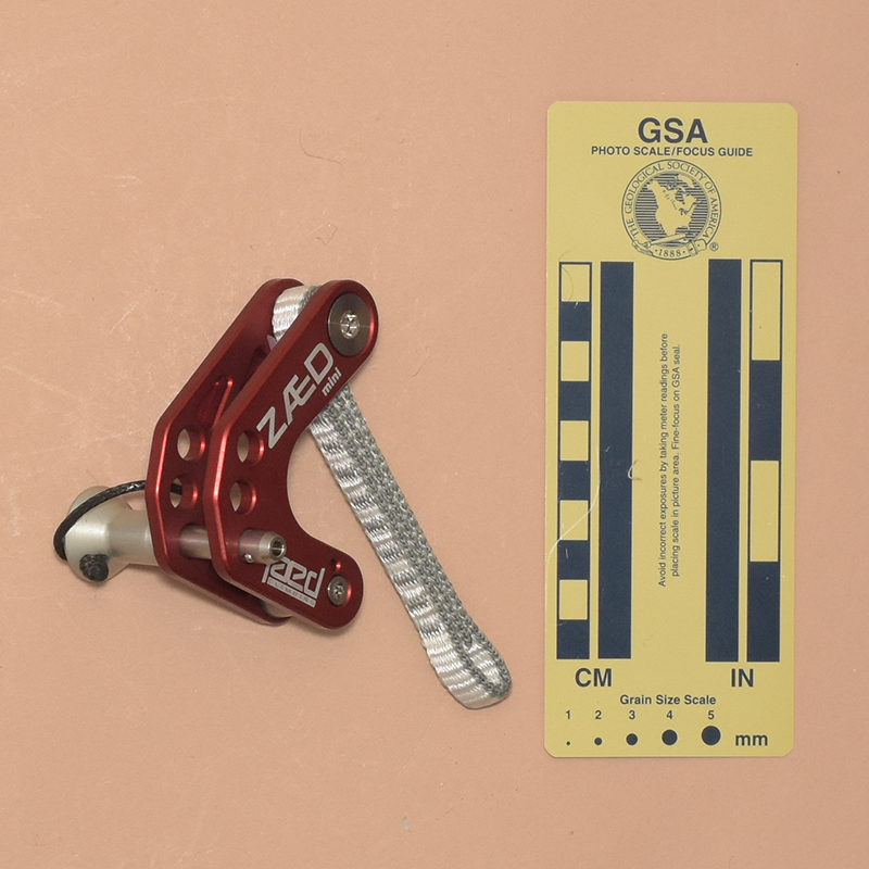 This ZÆD consists of two 13.55 mm. aluminum plates separated by 15 mm. There is a large anvil between the plates. The lower portion of the anvil has two grooves that leave a rounded tooth to contact the rope. A half-bollard below this has a shallow V-groove to center the rope. Three 8.4 mm. holes on the right side accept an 8 mm. quick release pin. A 110 mm-long 10.7 mm webbing sling is sewn around the top bollard. It has a loop at the distal end for clipping carabiner.