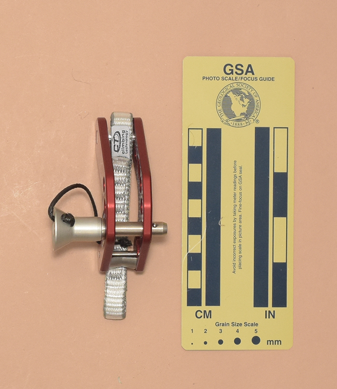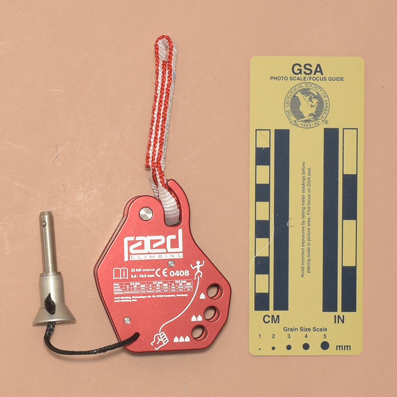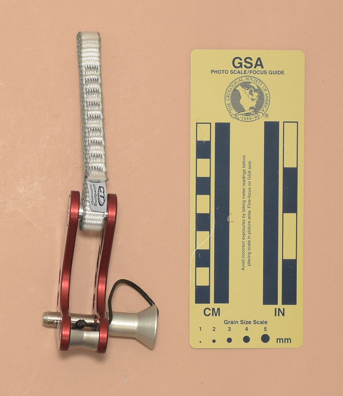 The ZÆD mini consists of two C-shaped 5 mm. aluminum plates separated by 15 mm. There are two connecting bollards. The top is a 9.8 mm. stainless steel shoulder bolt. The other has a shallow V-groove that is 11.6 mm. in diameter at the plates and tapers to 8.6 mm. at the center. Three 8.4 mm. holes on the right side accept an 8 mm. quick release pin. A 110 mm-long 10.7 mm webbing sling is sewn around the top bollard. It has a loop at the distal end for clipping carabiner.
