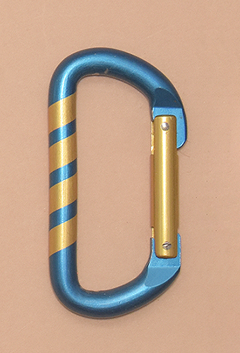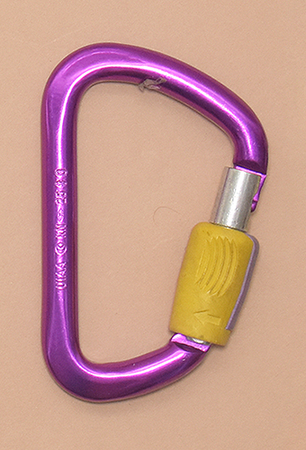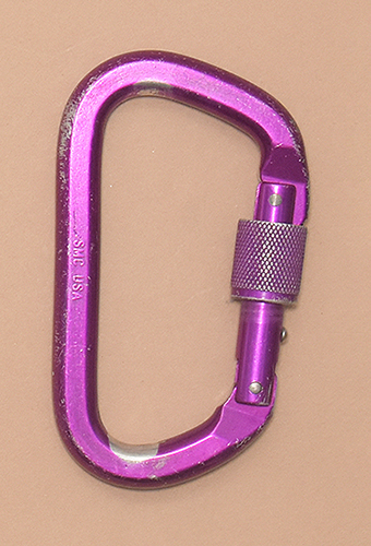 I need a locking carabiner, and my friend hands me one. I move the dumb-hickey blocking access to the gate aside. Now I easily spin the sleeve the left with my thumb, open the gate, clip the carabiner where I need it, spin the sleeve closed, and swing the dumb-hickey back in place.