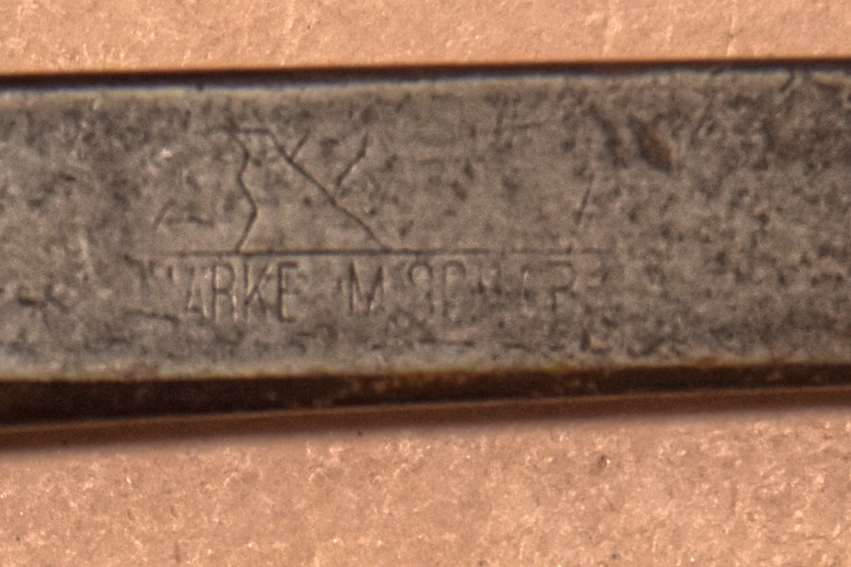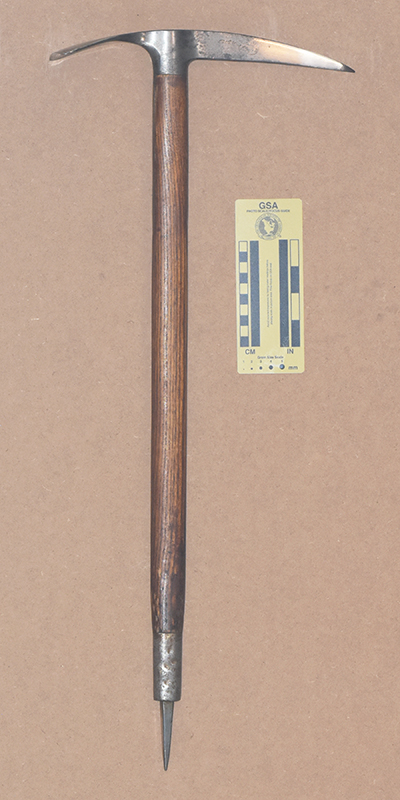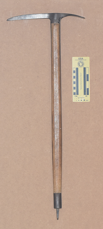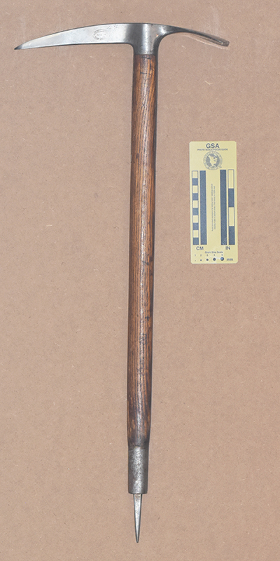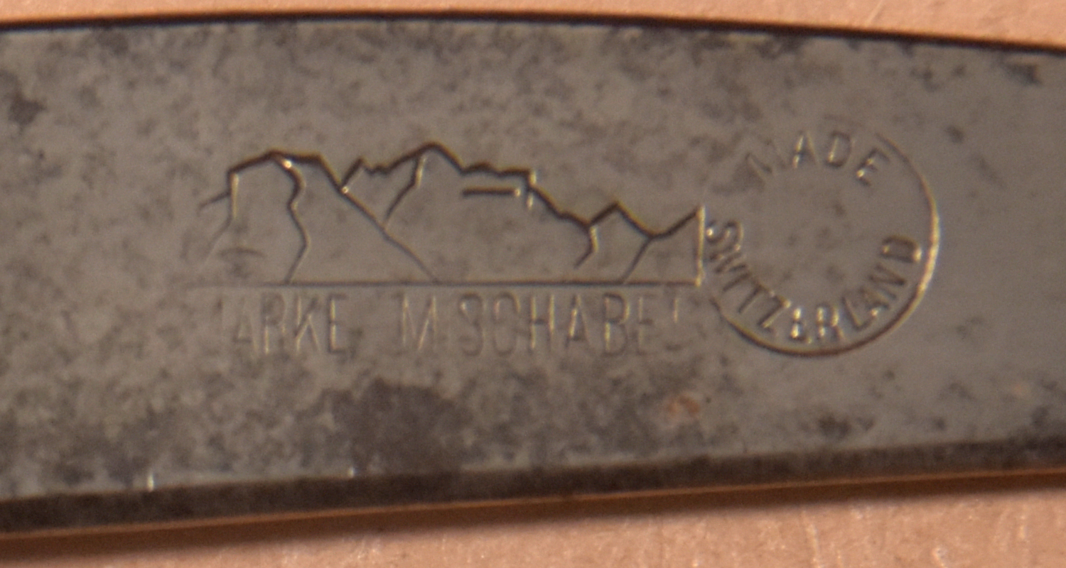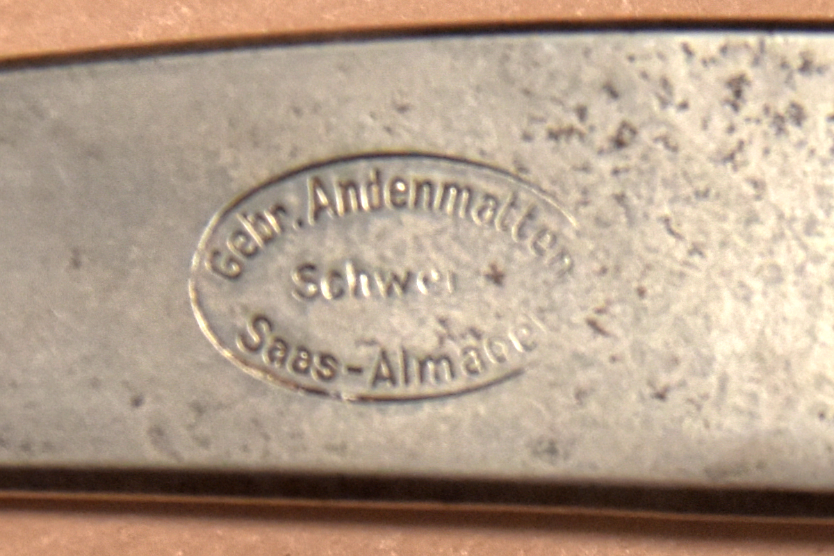 The Andenmatten brothers Florinus and Severin of Saas Almagel, Switzerland started making ice axes in 1918. The first logo had GEB.ANDENMATTEN, SCHWEIZ, and SAAS-ALMAGEL in three rows of capital letters. In 1930 the inscription changed to use lower-case letters. Some axes also had a mountain silhoutte with MARKE MISCHABEL stamped on the other side. Severin's son Ernest continued ice axe production into the early 1970s.
