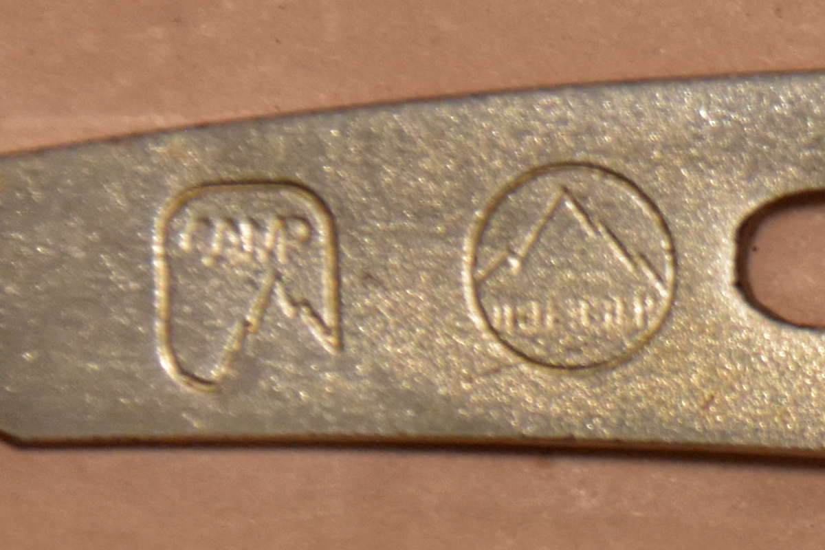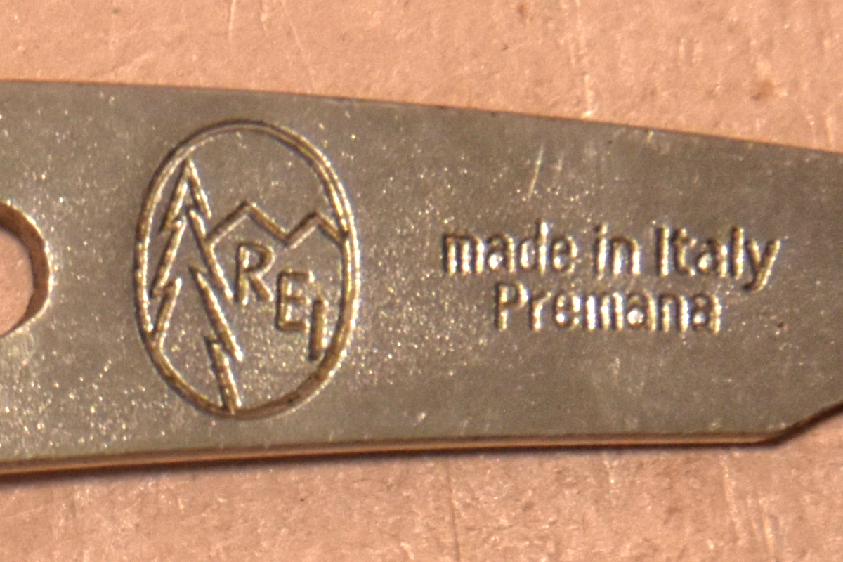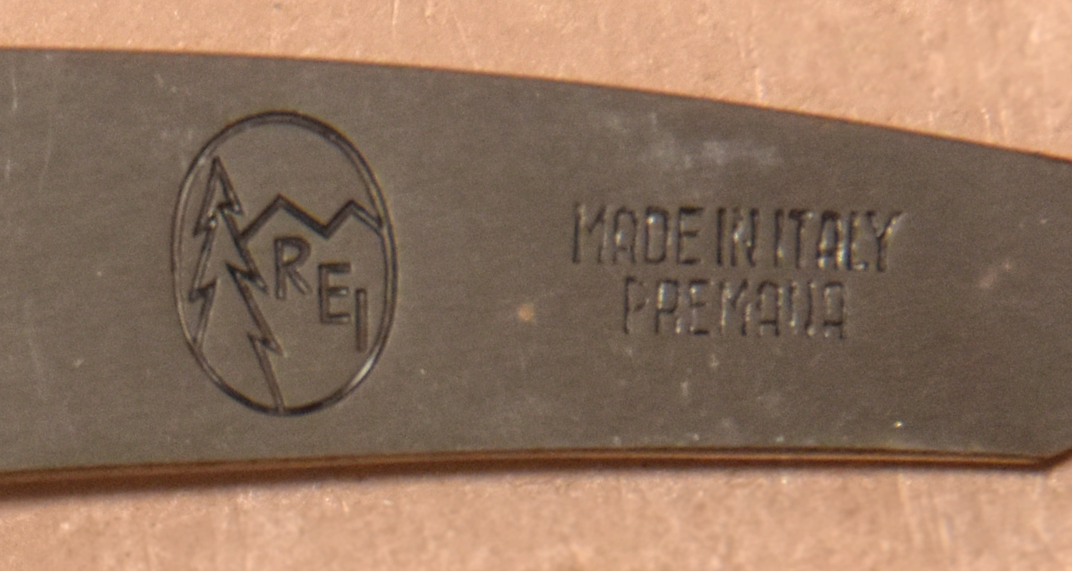 For special orders of large quantities (usually for entry-level equipment), CAMP has added the REI stamp (see below, front and back of an ice axe blade).