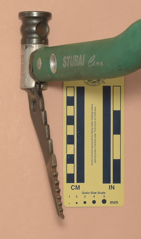 - Modular waterfall ice pick with a neutral-clearance chisel tip and with seven notches near tip then four coarse teeth.
