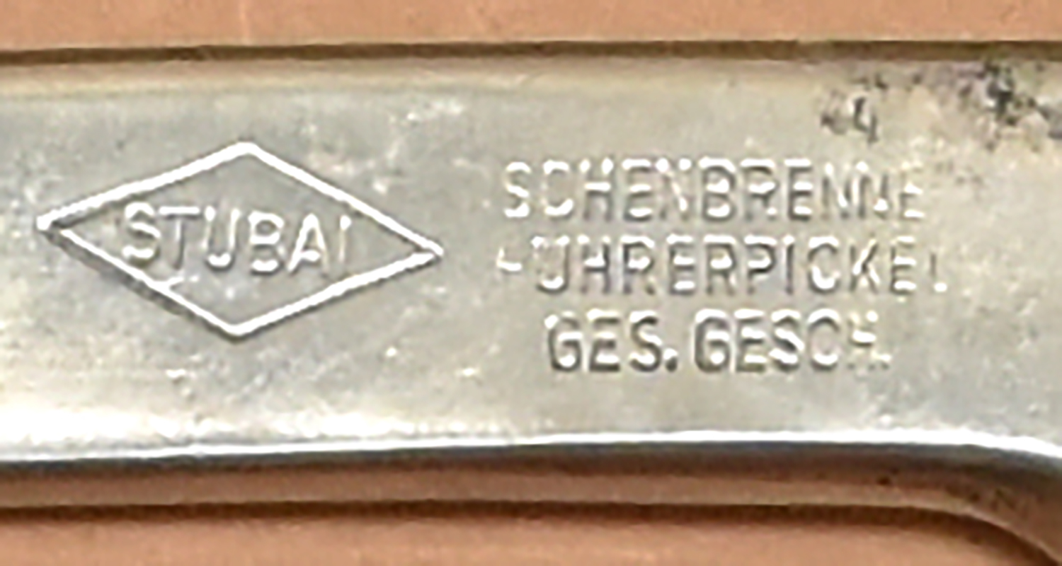 Many military paraphernalia vendors falsely (and sometimes unknowingly) market Stubai Swiss Military (and "Standard" model) ice axes with the Stubai diamond logo as War World II souvenirs. Stubai's history shows that the Stubai diamond marks started in 1960. The "Standard" model was not developed until the late 1960s. Stubai's Swiss Military and "Standard" models are not War World II axes.