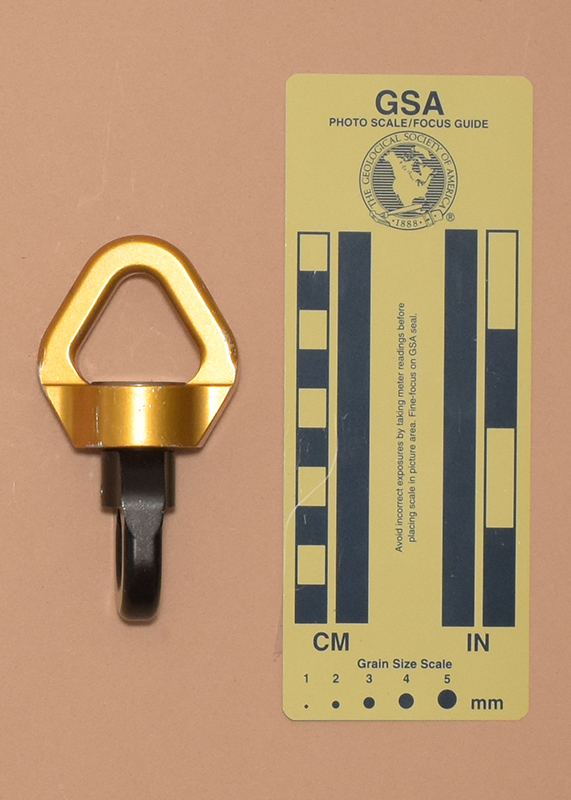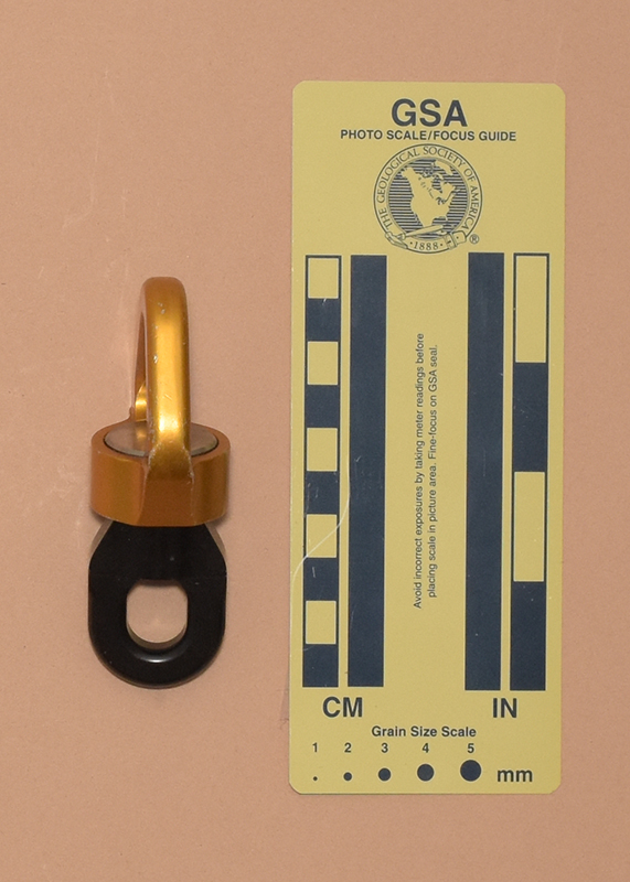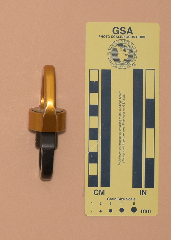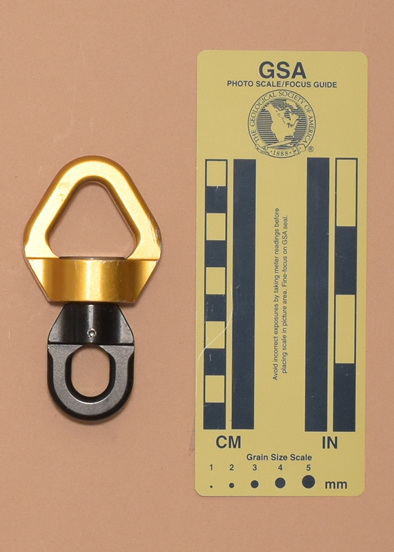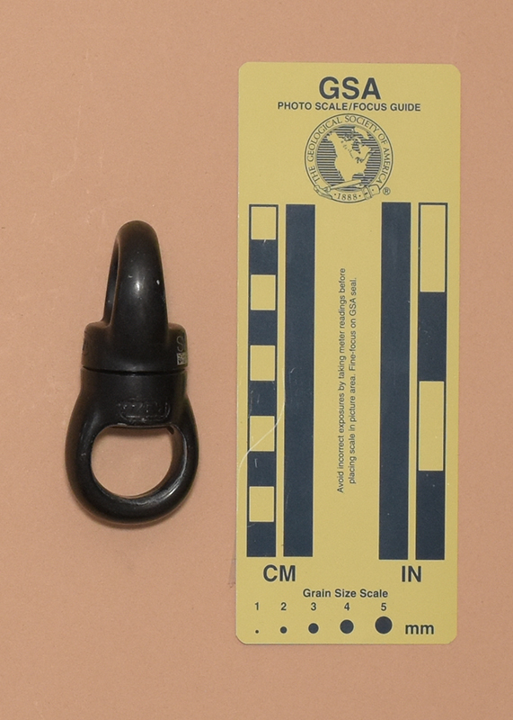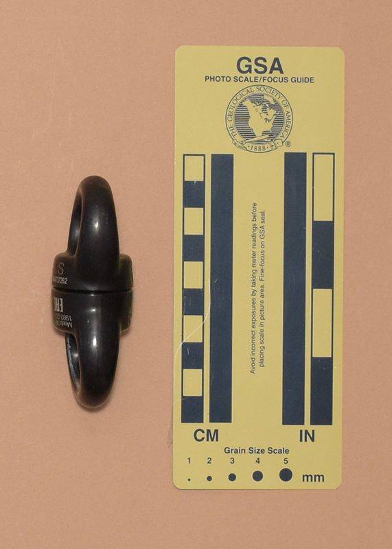 One half has SWIVEL S," an IQR code, and "22E0404737262" printed on one side. The other half has"Meets NFPA 1983 (2017 ED), "EAC," the UL Classified logo, "45YF" and "TP/TC 019/2011" printed on one side. Both halves have the Petzo logo forged on the side opposite the printing.