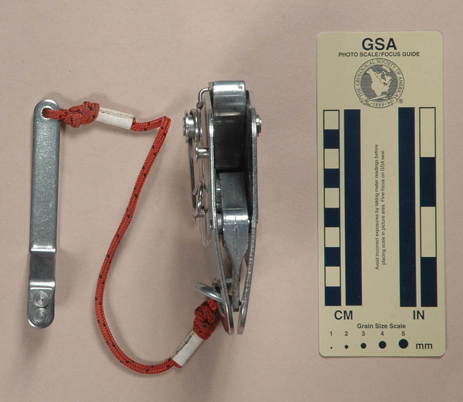 The cam casting is diamond-shaped, with flat faces where it runs against the rope. The cam presses the rope against a flat face on an anvil casting pinned to the bottom left of the rear plate. These pins extend above the castings to 12 mm. diameter heads, leaving gaps to be engaged by a slot cut in the front plate. The remaining casting is a lever near the top of the rear plate. A spring rotates the lever counter-clockwise, where a portion of the rear plate bent in from the attachment point stops further lever rotation.