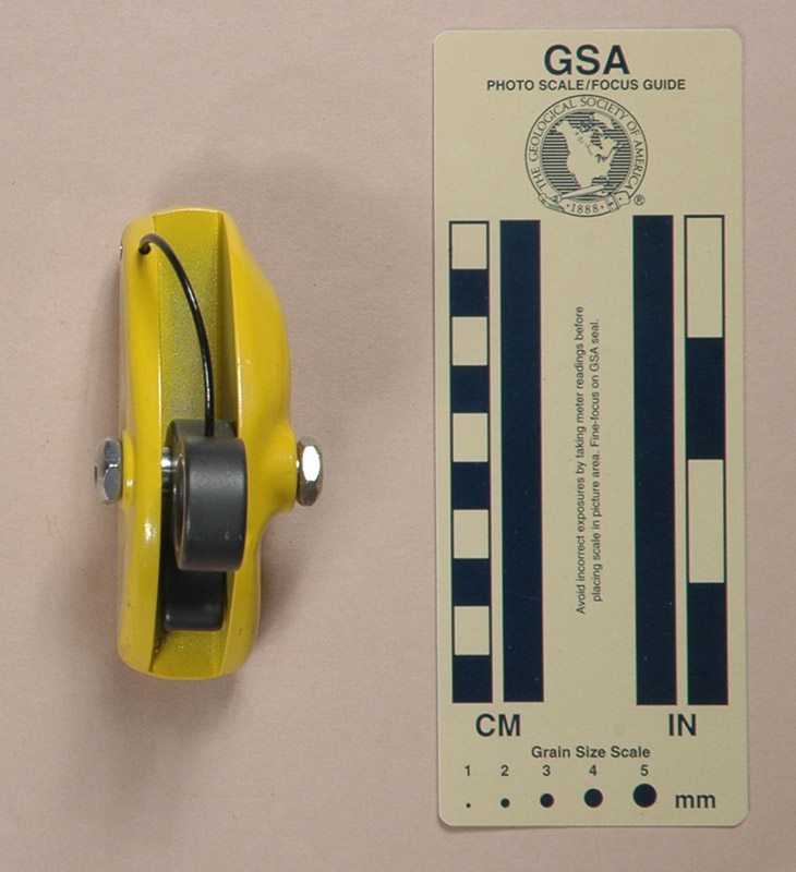 There is another pin on the rear plate that supports another lever. One end of this lever rides against the rope, while the other has a hook extending into the rear plate attachment eye. A spring acts to rotate the second lever clockwise, pressing the left end against the rope. A plastic knob in a housing attached to the lever allows blocking the lever movement. A post above the lever supports a friction-educing roller.