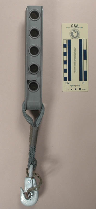 Version A is 243 mm. tall, 59 mm. wide, 38 mm. thick, and weighs 633 g. It consists of five hollow 25.6 mm. diameter, 32.7 mm. aluminum bars welded to a stamped frame. There is one tab welded to each side. The entire device is hard anodized. This one has an attached sewn sling with a clip hook at the end. The hook has a wire pin safety.