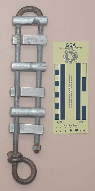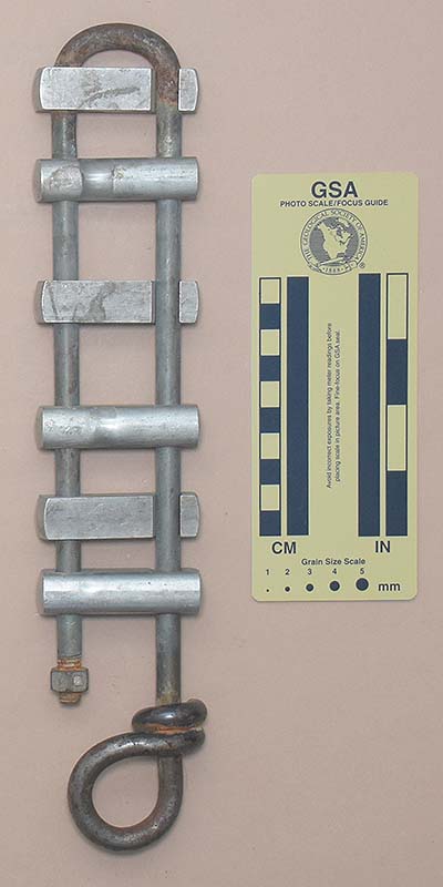 There are no markings on the rack. The bars are stamped with "Cmi." Rick stamped "R C B" on the first through fourth and sixth bars. He stamped "NSS 8083," "R. C. BANNING," "7111 CARROL," and "TAKOMA PK. MD." on the fifth bar.