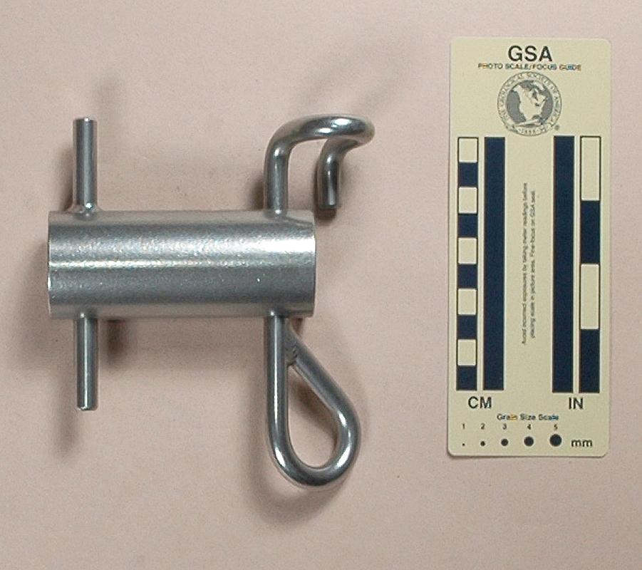 The tube is 1-5/8 inch 304 stainless steel tubing. The inner end has holes through which pass an 11 mm. rod with an eye at the lower end and a hook at the upper. A second hole on top engages the hook when the device is in use. A vertical rope retention rod passes through and is welded to the outer end.