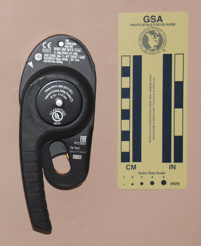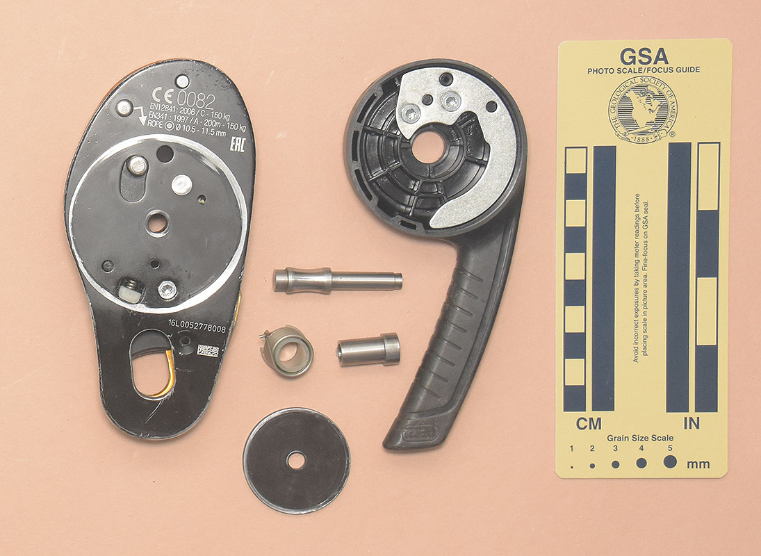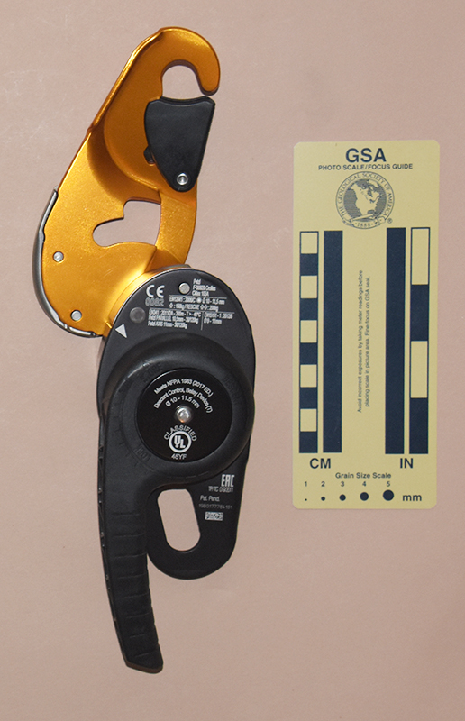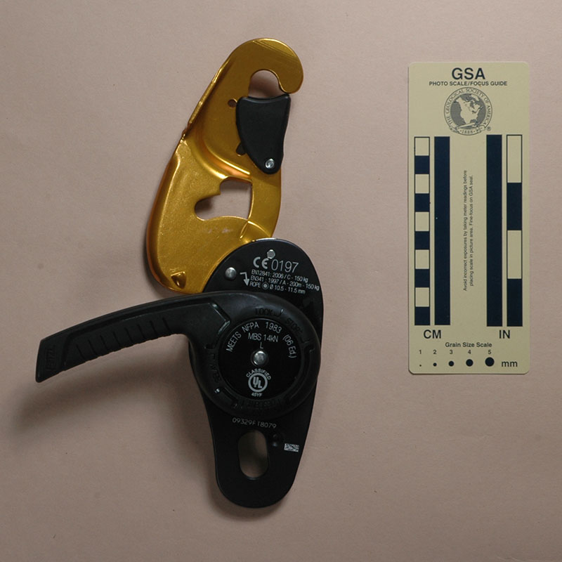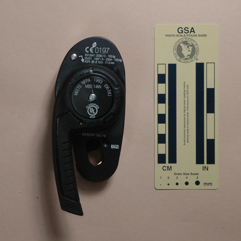 The plate at the rear center of the handle is marked with "MEETS NFPA 1003 (2017 Ed.)," "Descent Control, Belay Device(T), "Ø 10-11.5mm," the Underwriters Laboratory "classified" logo, and "45YF." The inside has symbols that I believe are intended to show how the device is rigged. One symbol looks like a shepherd’s crook, the other shows a hand holding a rope. The main bollard has the Petzl Logo cast into it. The plastic safety catch has the Petzl Logo molded into it.