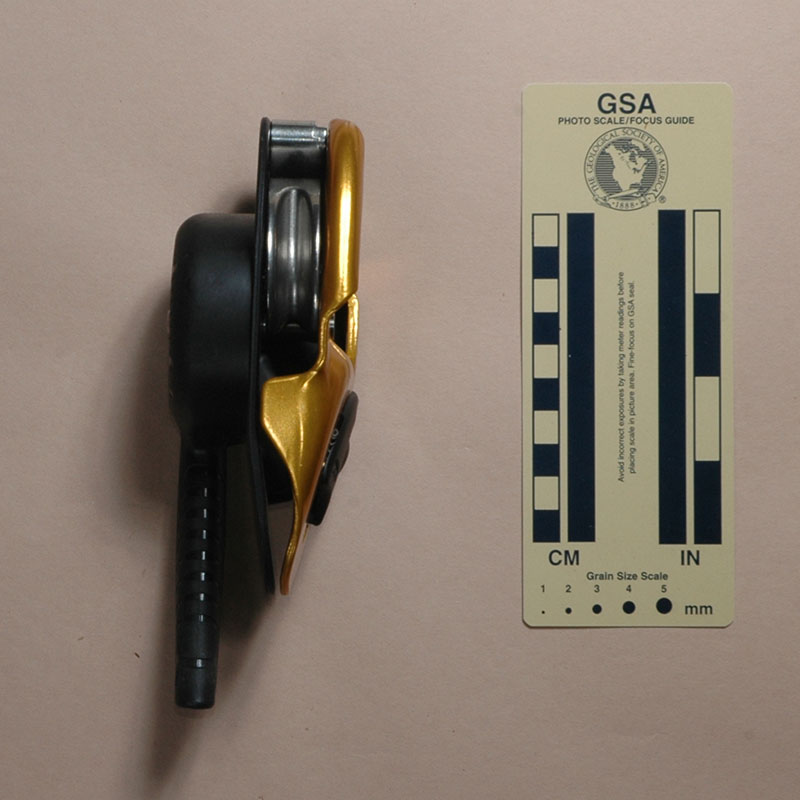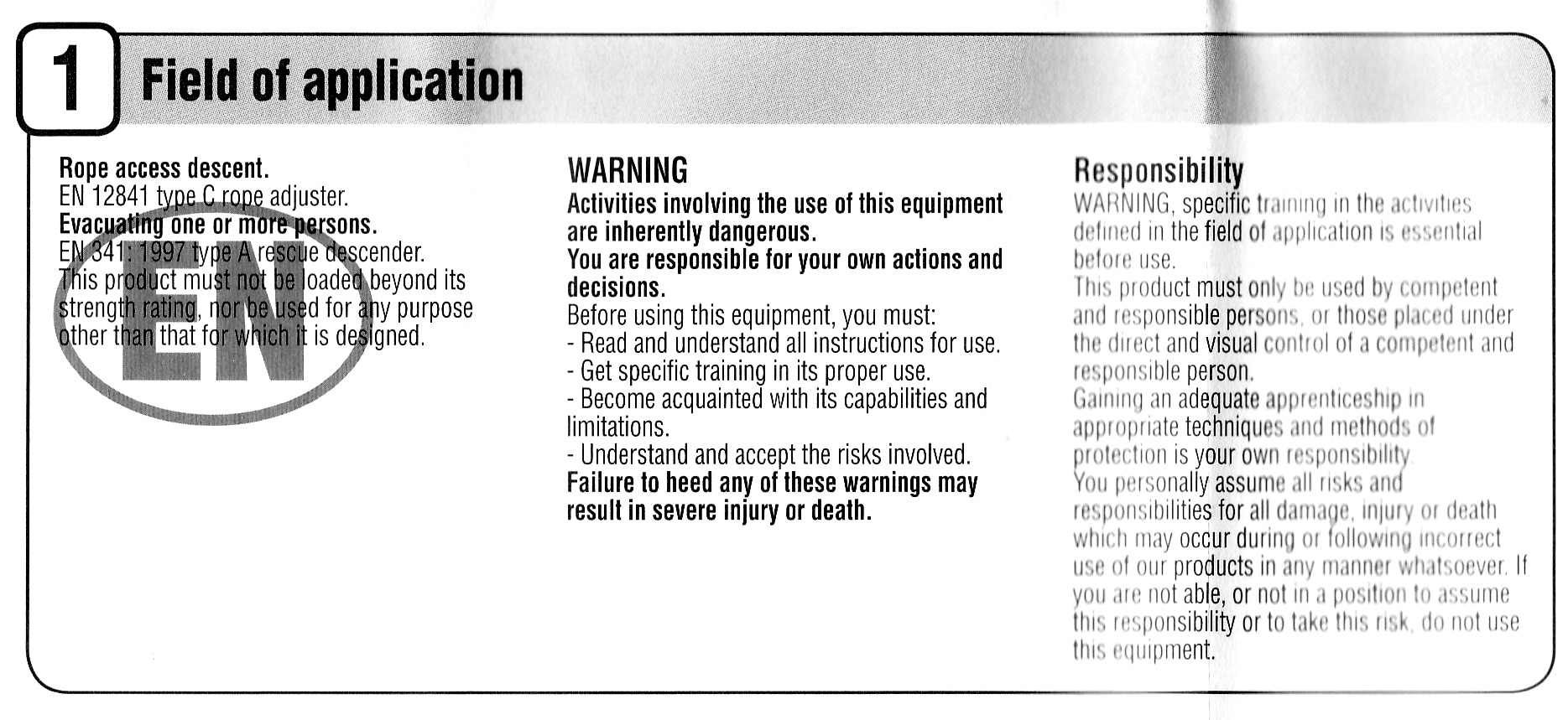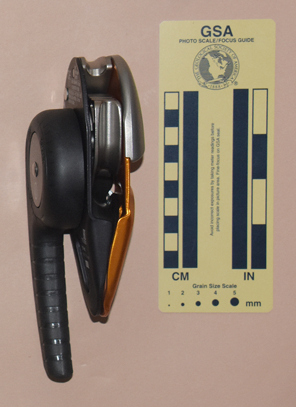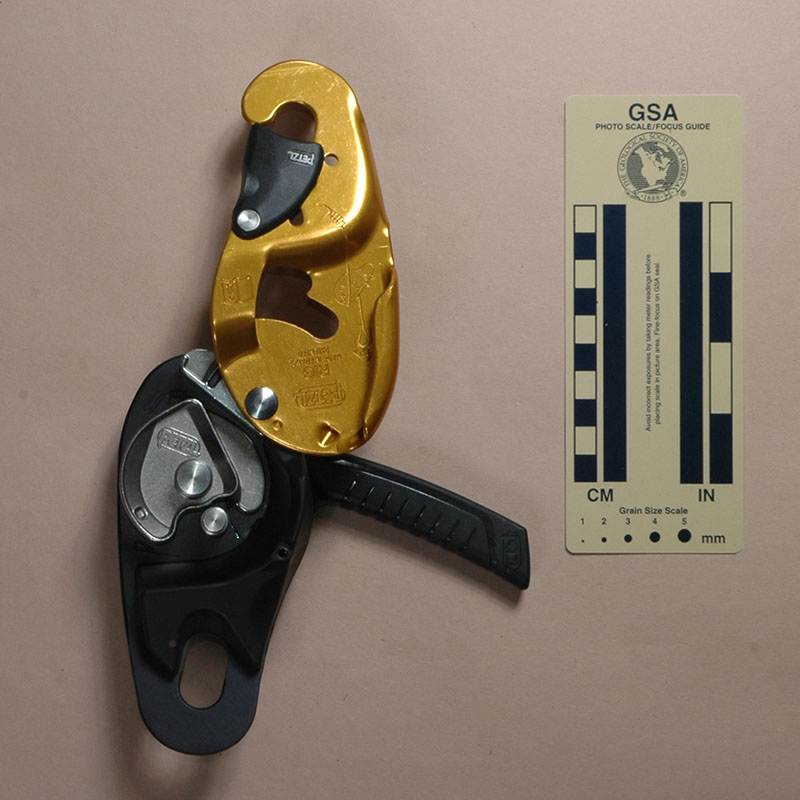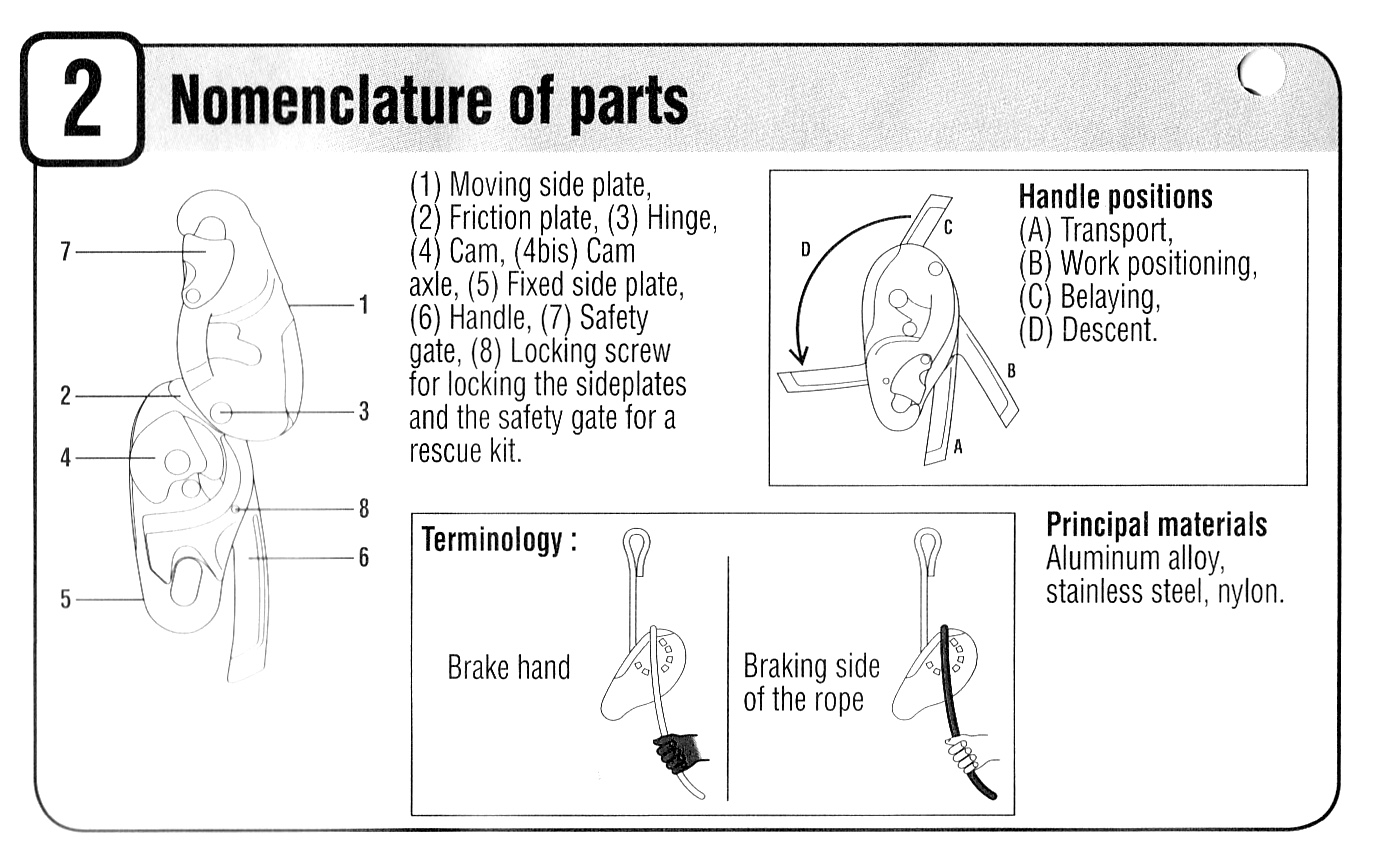 The plate at the rear center of the handle is marked with "MEETS NFPA 1003 (2017 Ed.)," "Descent Control, Belay Device(T), "Ø 10-11.5mm," the Underwriters Laboratory "classified" logo, and "45YF." The inside has symbols that I believe are intended to show how the device is rigged. One symbol looks like a shepherd’s crook, the other shows a hand holding a rope. The main bollard has the Petzl Logo cast into it. The plastic safety catch has the Petzl Logo molded into it.