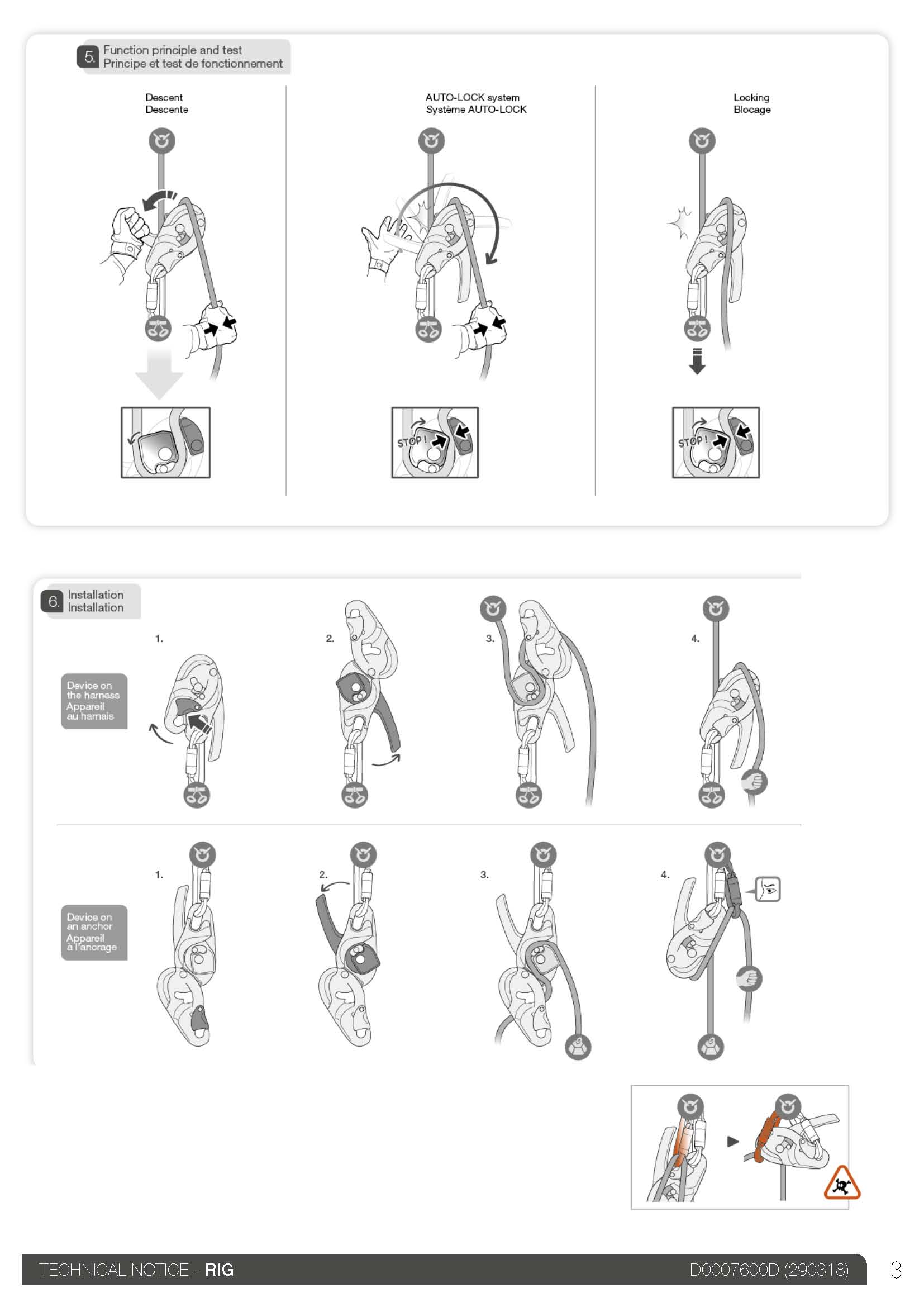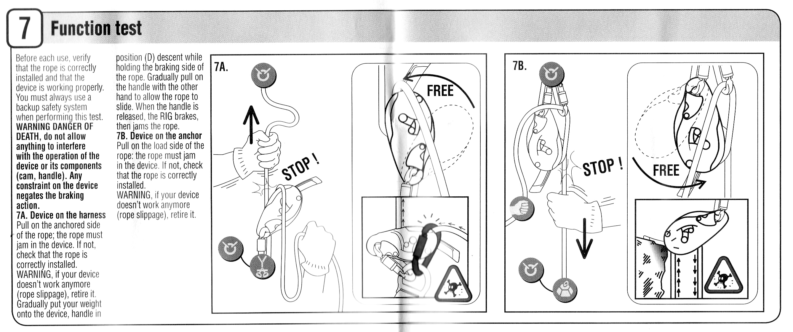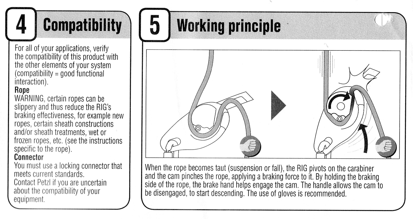 The front plate is stamped with a hand holding a line representing the rope, a Reading-Is-Dangerous icon, "RIG," and another line representing the rope to the anchor.