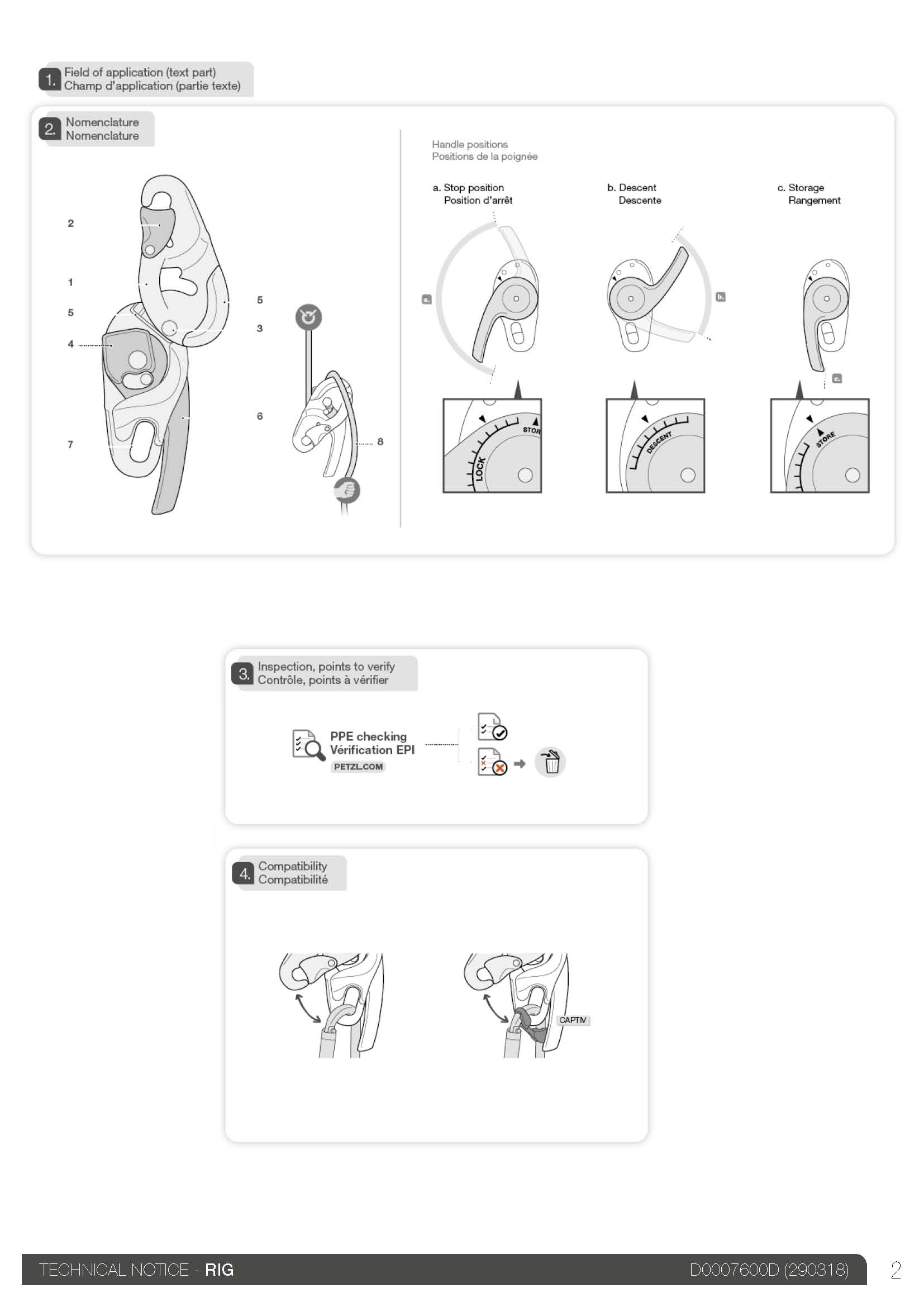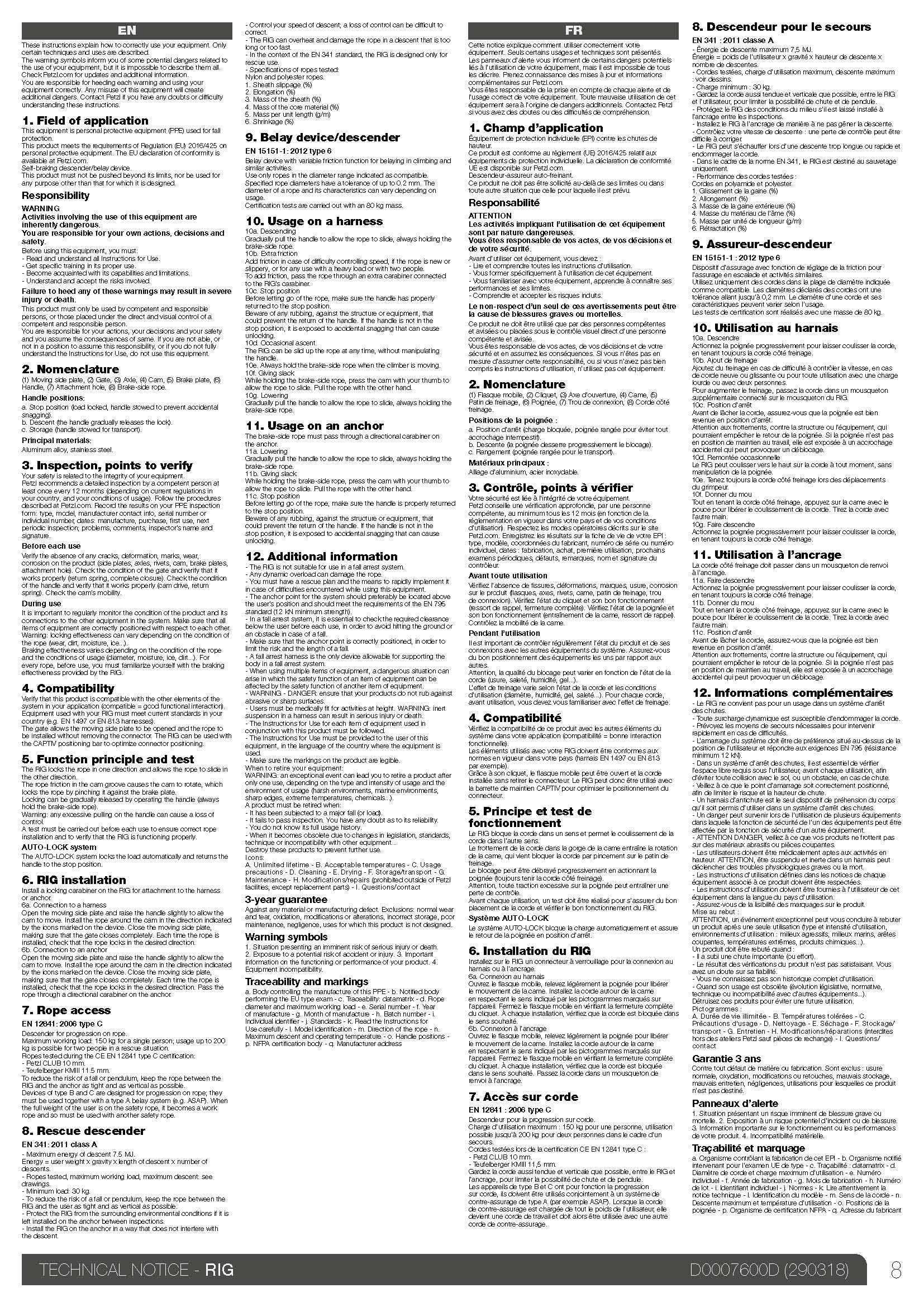 The front plate is stamped with the Petzl logo, "Rig," "MADE IN FRANCE," "PATENTED," a book-with-an-"i" icon, and an illustration of the device in use. The outside of the rear plate is marked with an indexing arrow pointing to the handle markings, "CE0197," "EN12841:2006/c - 150 kg," "EN341:1997/A - 200m - 150 kg," "Rope * Ø 10.5 - 11.5 mm, "09329FT8079" and a digital scanner ID pattern. and "MAX 150 Kg /200m." The inside has symbols that I believe are intended to show how the device is rigged. One symbol looks like a shepherd’s crook, the other shows a hand holding a rope. The main bollard has Petzl logo cast into it. The handle has various index markings labeled "DESCENT, "BELAY," "LOCK," and "STORE." The retaining washer is marked with "MEETS NFPA 1983 (06 Ed.)", "MBS 14kN", "L," the UL "Classified" logo, and "45YF."