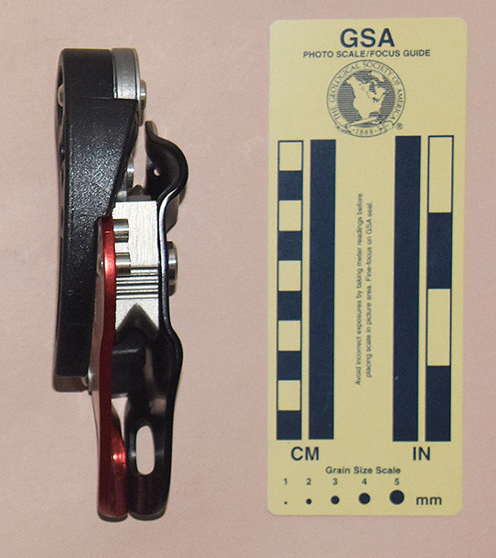 The cam and anvil are cast from stainless steel. The cam can rotate about 25° clockwise with respect to the rear plate. When loaded, the cam rotates clockwise, and the flat top surface of the cam squeezes the rope against the anvil. A lever mounted on the top of the cam engages the cam, controlling its motion. A spring-loaded plastic handle on the rear of cam gives the user more leverage to release the cam.