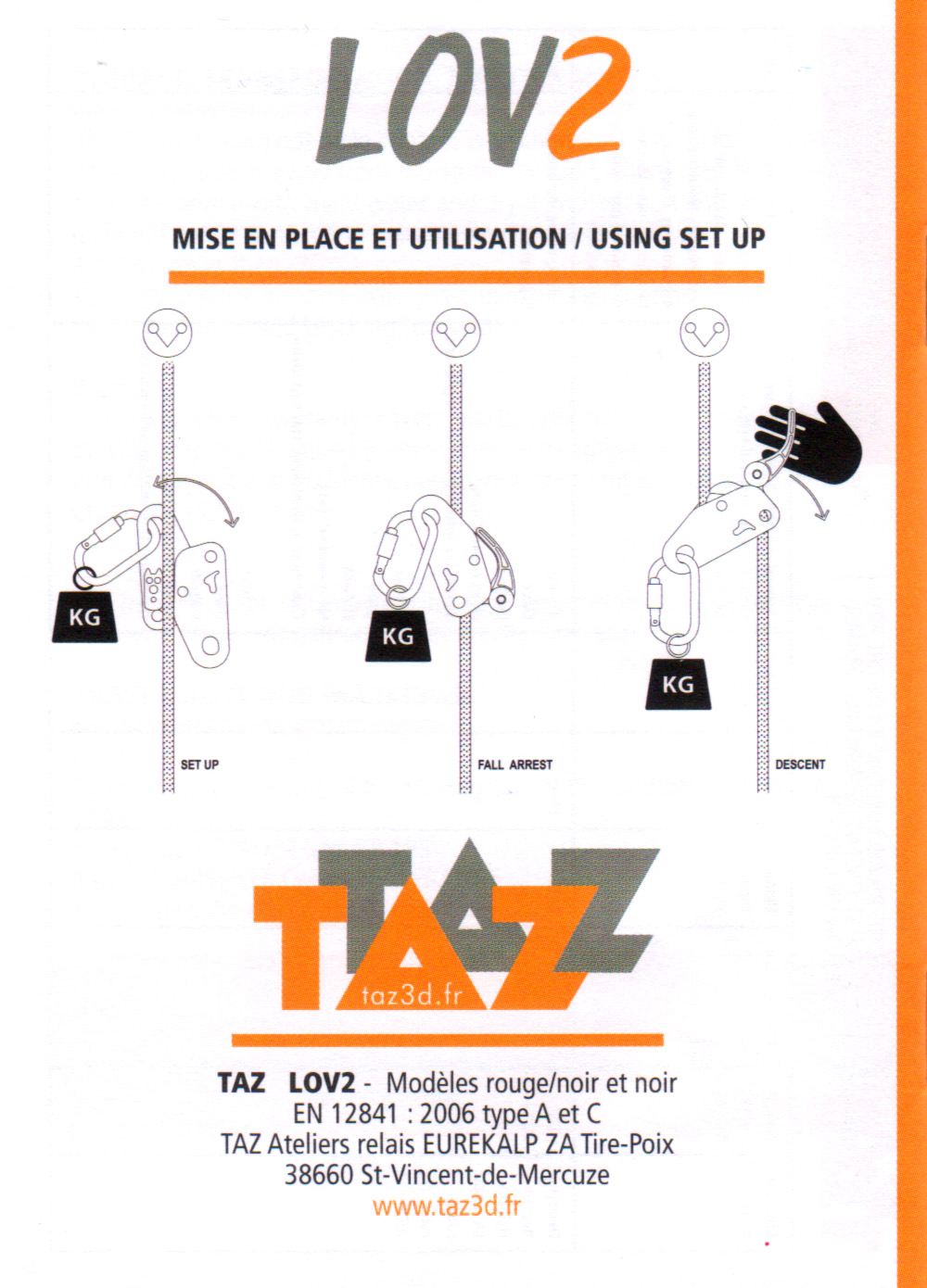 The final use is as a rope grab, or as TAZ calls it, a fall arrest. In this case, the Lov2 is rigged as if for rappelling. In the event of a fall, the user finds himself "on rappel" with his hands off the rope. The autostop function should prevent his descent, but that depends on rope conditions. In any case, it should slow the fall considerably.