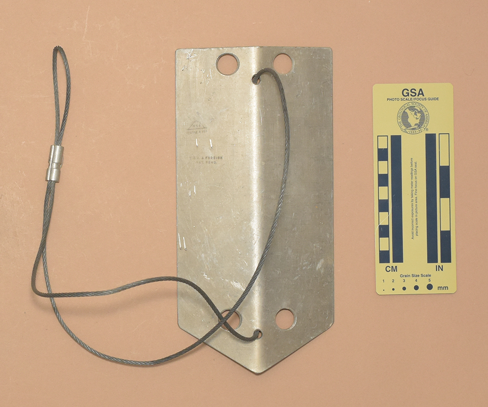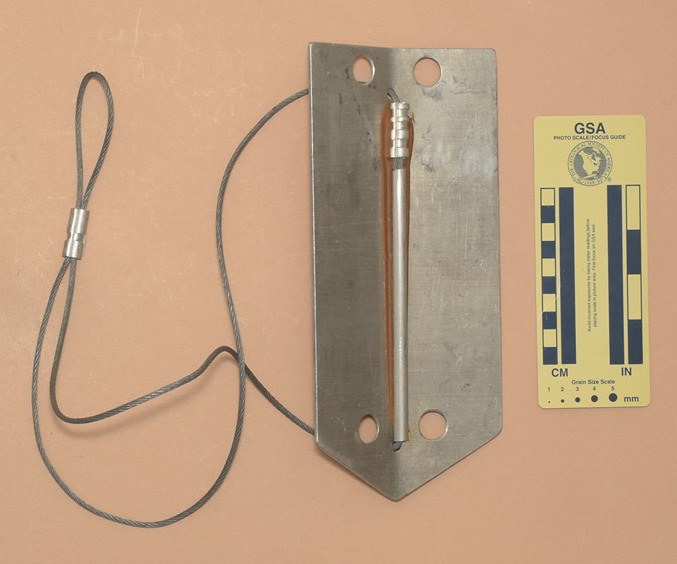 Bent aluminum alloy plate. 3.2 mm. stainless steel cable with crimps and guide tube glued to inside of fold.