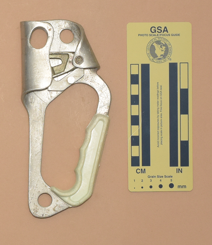 3455 | Petzl Ascentree, Version B (half) | RH cut from dual-handled double-rope ascender, stamped frame, rubber grip, oval top and subtriangular bottom hole, semi-web cam /w sloping teeth, plastic safety below cam | On Rope 1, 2021 | 169 | 193 | 101 | 27 | 522 | 14.5 | 32 | (3.4)(1S1)^2(2S2)(1S1)^3(2.3.4.3) |