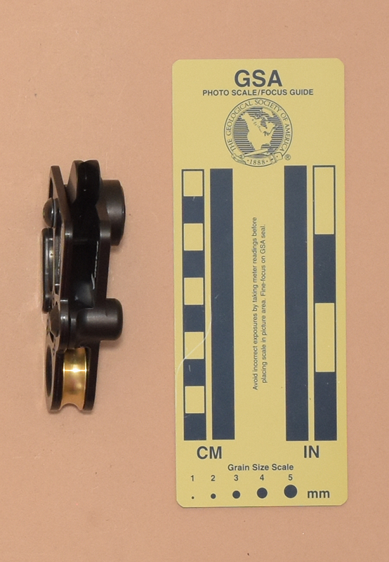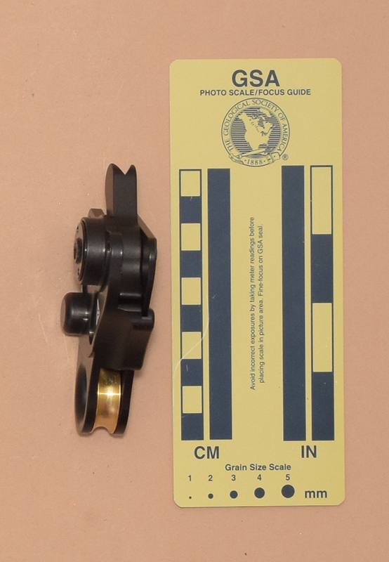 The cam is milled from aluminum alloy and hard anodized. It has six rounded transverse grooves forming six rounded teeth. The cam radius increases from 11 to 21 mm. over an angle of 83°, giving a 24° cam angle. The upper portion of the cam has a V-shaped groove to guide the rope when the ascender is loaded.