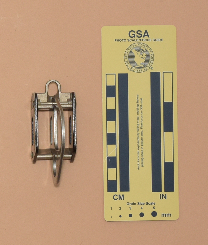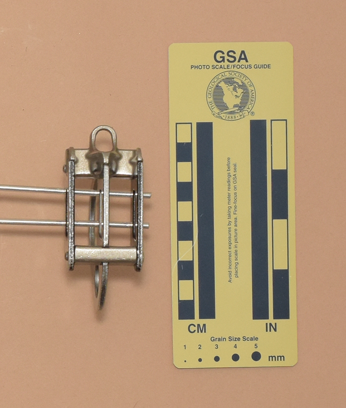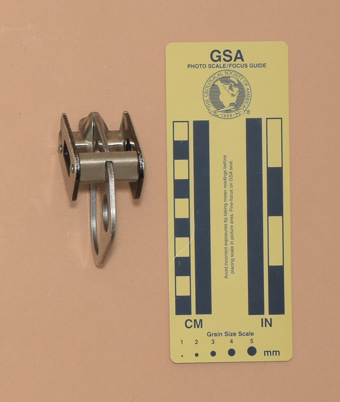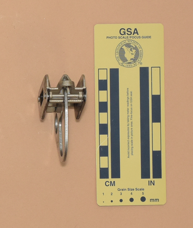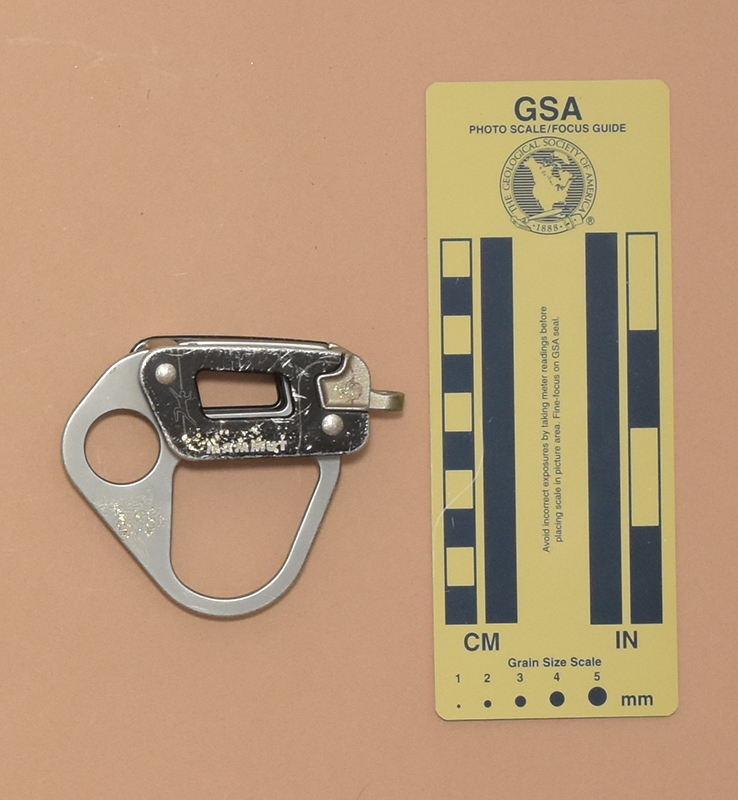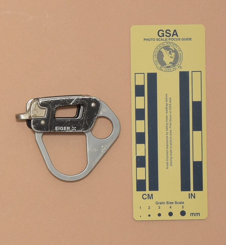 My Mammut Eiger is 87 mm. long, 37 mm. wide, 71 mm. high, and weighs 75 g. It consists of two cast stainless steel pieces and a central aluminum plate riveted between two aluminum side plates. One of the pieces has two V-notches for the main line and a small accessory eye. Each V-notch has an internal rib on each side. These are offset to give a slight dogleg to the rope path. The other stainless piece provides a smooth running surface. The central plate has a 19 mm. round eye at the side opposite the V-grooves, and a 37 mm. by 37 mm. irregular hole below the rope channels.