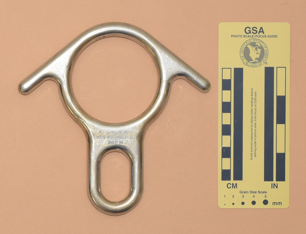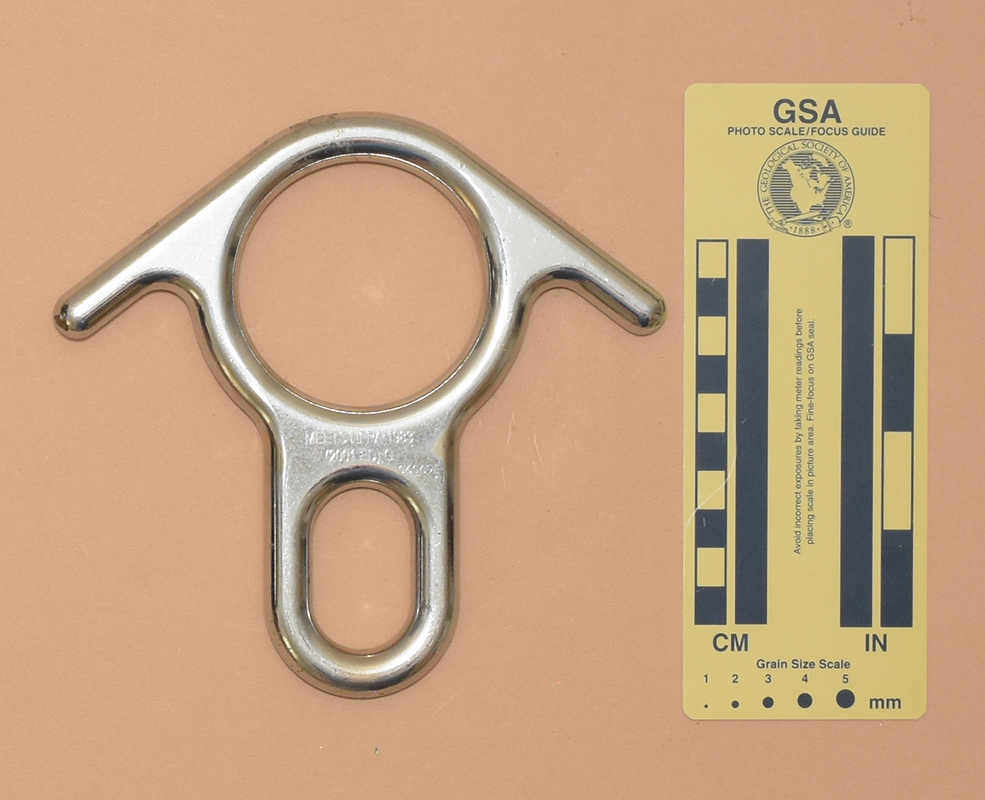 This is another forged steel rescue eight. This is a steel eared eight that is labeled for rescue use. It is too large and heavy for general use. The slot is also too big to use as a belay slot, at least for realistic diameter ropes. The ears are longer than normal.